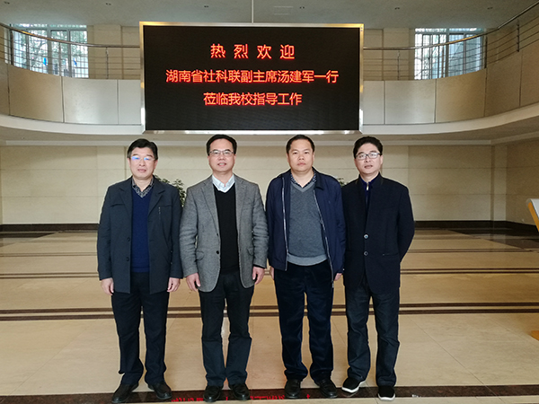 本网讯 2月17日上午,湖南省社科联党组成员、专职副主席汤建军莅临beat365官网调研指导,汤建军强调,要通过平台建设不断扩大优秀传统文化的影响,将文化自信变成一种思想、行动自觉,切实做好对传统文化的传承。