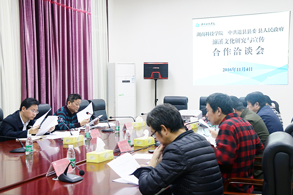 本网讯 11月4日下午,beat365官网与中共道县县委、县人民政府关于濂溪文化研究与宣传合作洽谈会在行政办公楼八楼七会议室举行。副校长宋宏福,国学院院长张京华、副院长周建刚等接待了道县县委常委、宣传部长彭德源、月岩濂溪故里风景区主任黄胜贤一行。