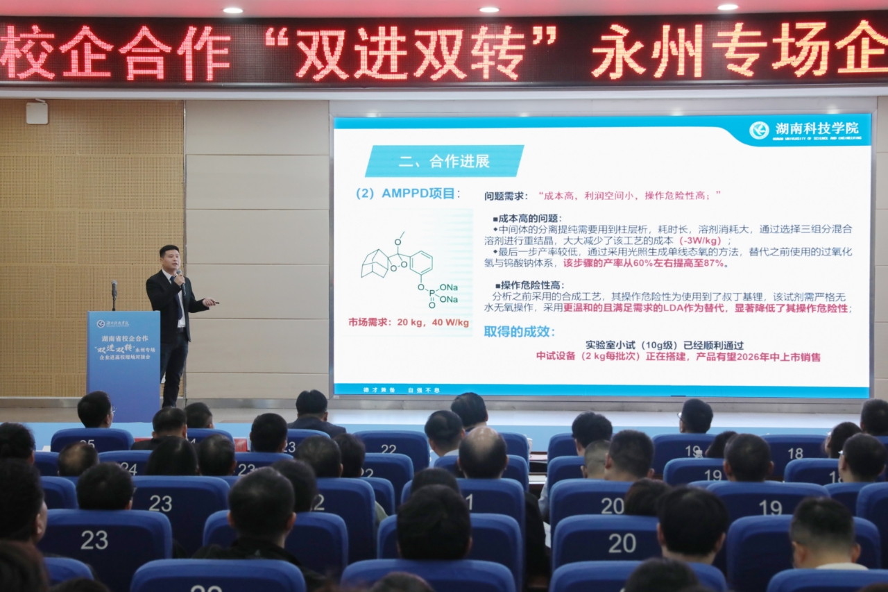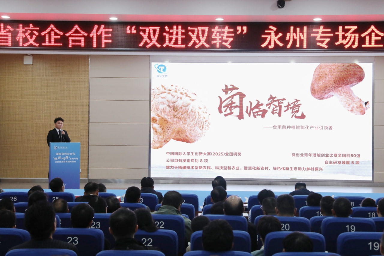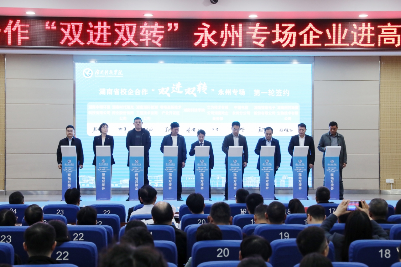 对接会现场,“粘土矿物资源高值转化与功能阻燃材料集成技术”等3个专家团队推介了科技成果,“菌临智境——食用菌智能化产业引领者”等2个大学生团队介绍了创新创业成果,学校与湖南中稀环保科技有限公司、湖南时代阳光药业股份有限公司等16家企事业单位签订产学研合作协议。