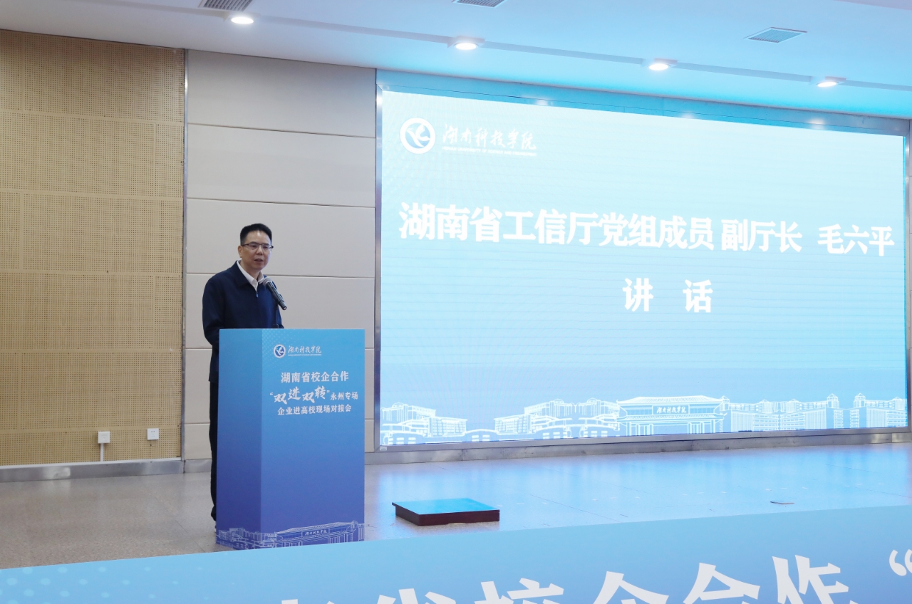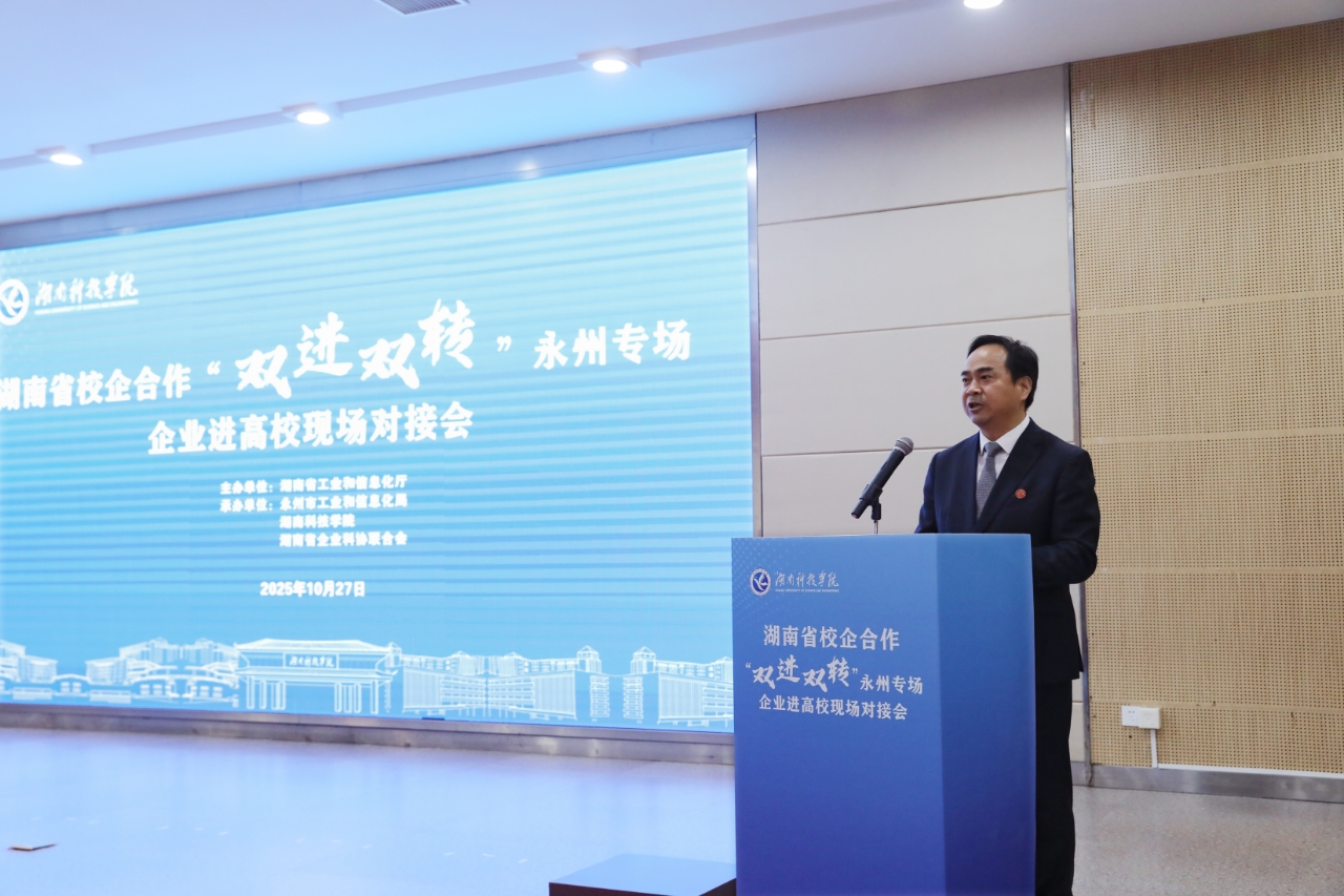 本网讯(记者 向薛峰 摄影 谢志豪)10月27日,2025年湖南省校企合作“双进双转”永州专场企业进高校现场对接活动在beat365官网举行,这是继湖南大学、中南大学之后,校企合作“双进双转”第3场企业走进高校活动。湖南省工信厅党组成员、副厅长毛六平,省委第十四巡视组组长林目轩,永州市政协副主席、市工信局局长方智毅,校党委书记李钢,党委副书记、校长黄创霞等领导出席活动。省市县相关单位、省企业科协联合会代表,专家和企业代表,beat365官网科研团队和师生代表共300余人参加活动。