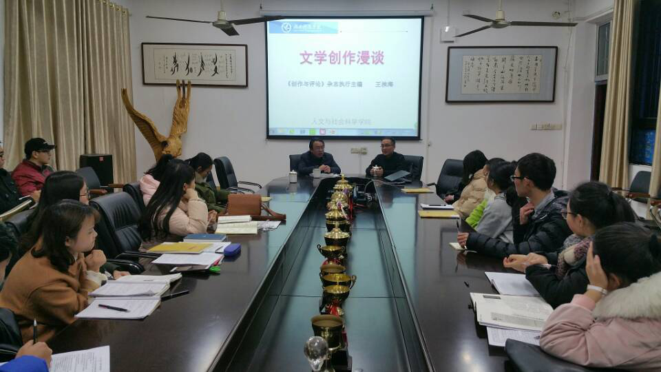 本网讯 1月12日,湖南省文联《创作与评论》执行主编王涘海应邀来校与西山文学社、源诗社文学爱好者分享“文学创作漫谈”。人文与社会科学学院党总支书记谷显明、传媒学院党总支副书记潘清远等出席。