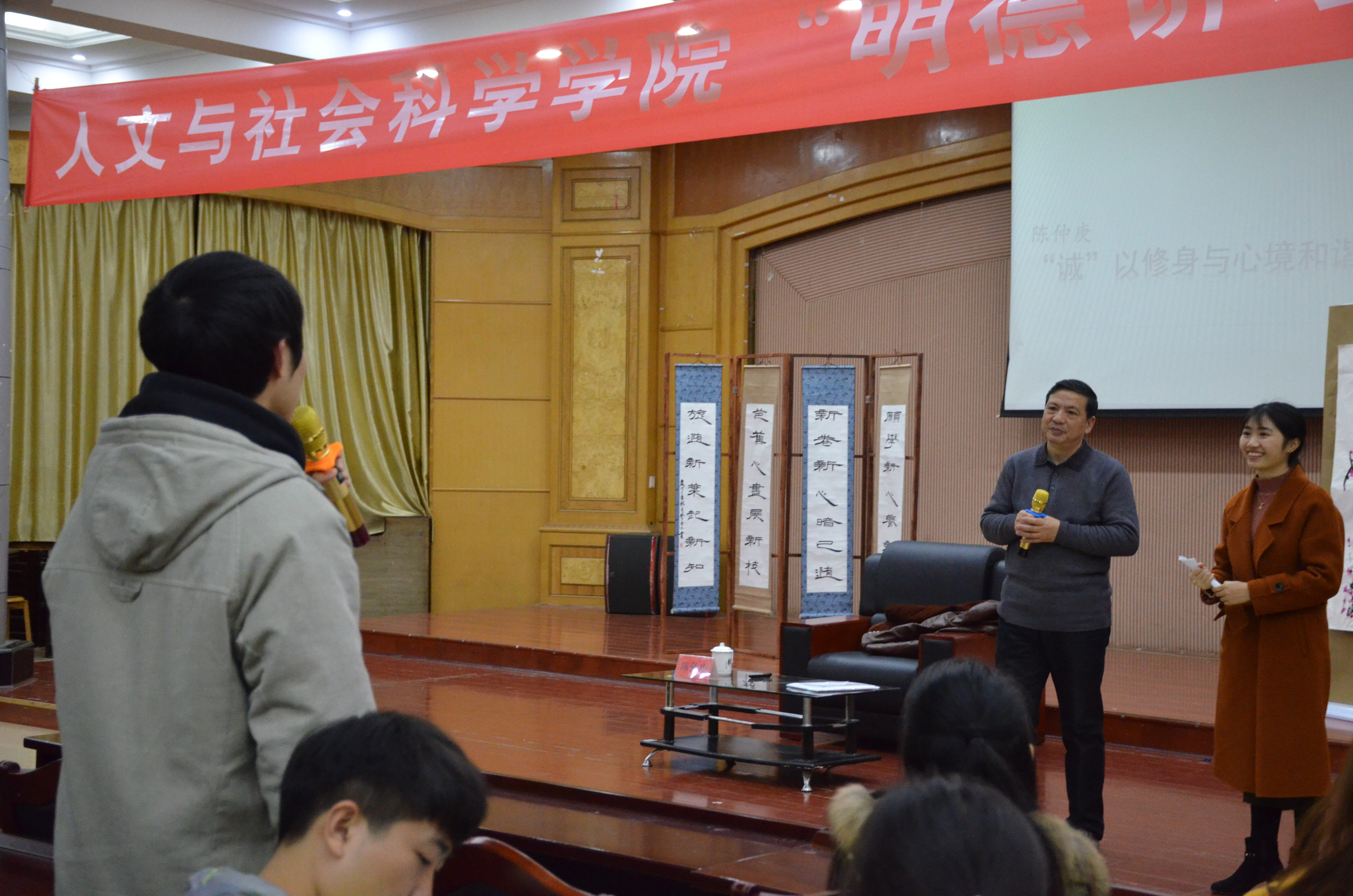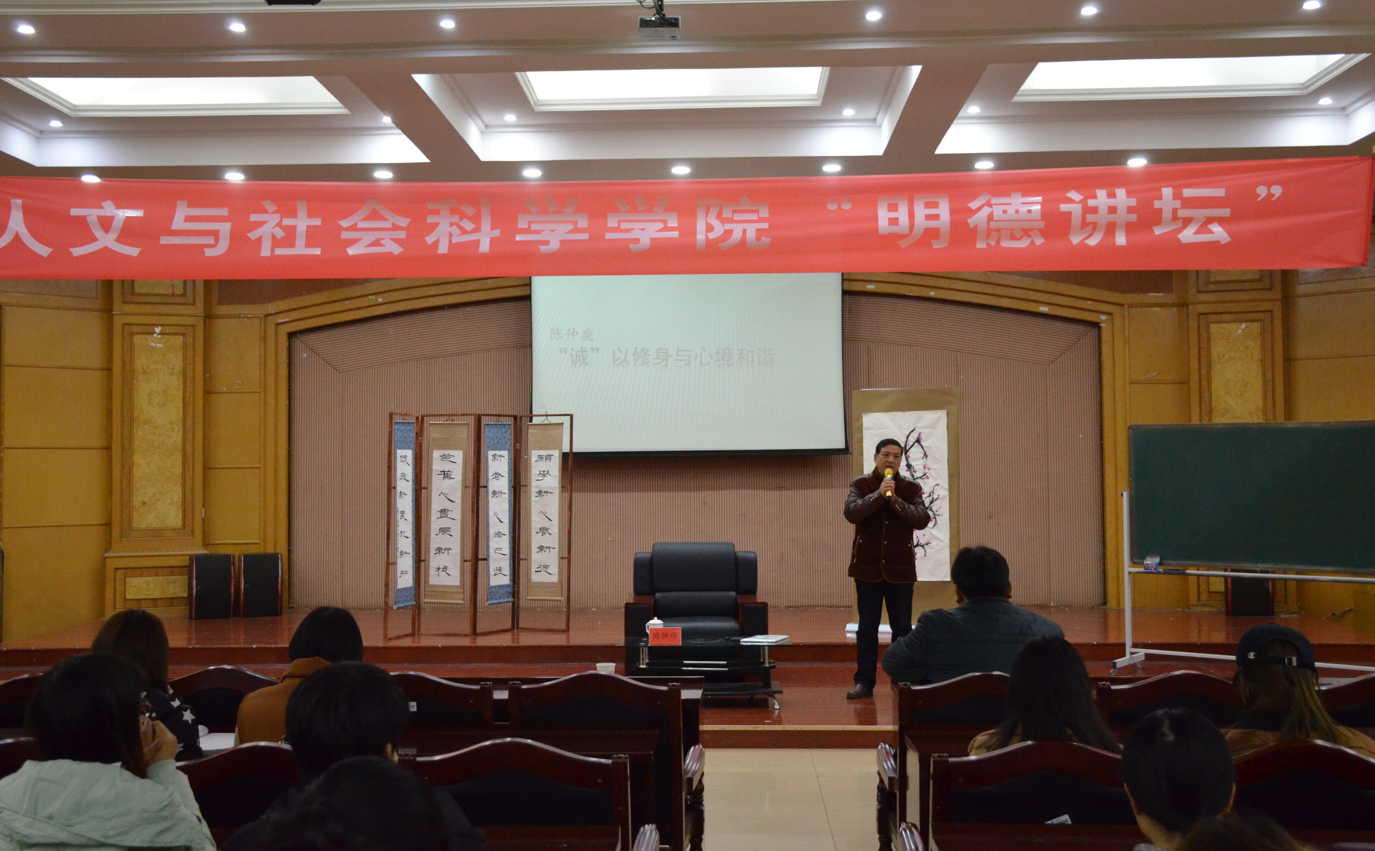 本网讯 11月30日晚,人文与社会科学学院“明德讲坛”邀请校工会主席陈仲庚教授担任主讲嘉宾,与大家共同探讨“‘诚’以修身与心境和谐”。