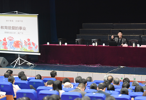 本网讯 3月28日下午,全国优秀教师、湖南科技大学吴广平教授应邀来校讲座。校党委书记陈弘、校长曾宝成与400余名教师代表共同聆听了此次讲座。