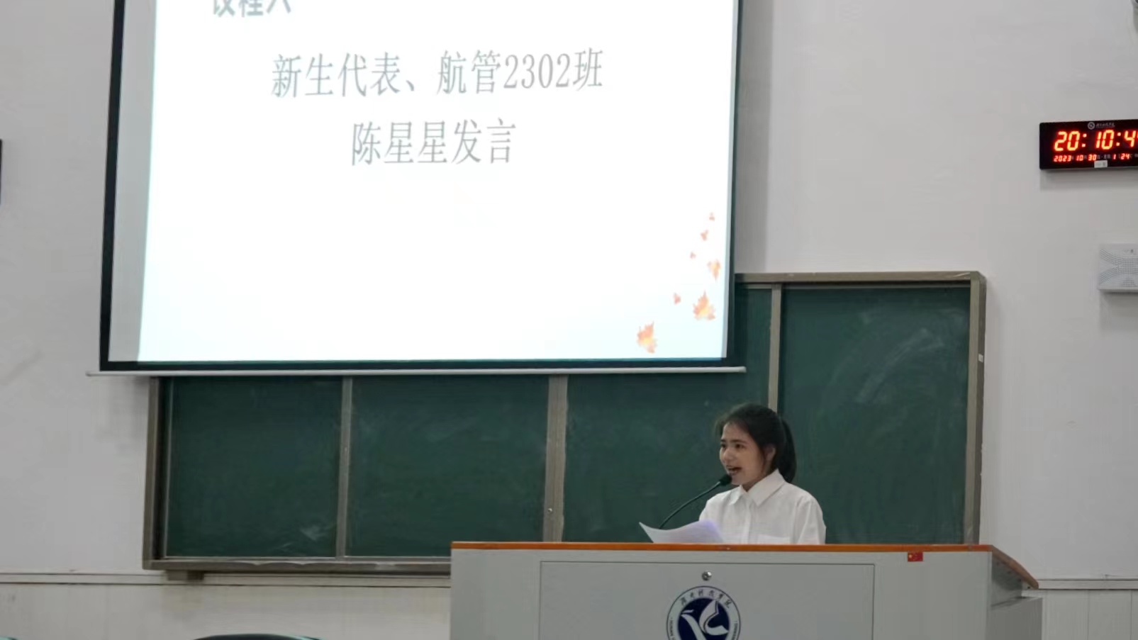 会议开始后,全体师生起立奏唱中华人民共和国国歌。随后蔡保忠副院长为新生们介绍了学院领导和全体教职工,让同学们对学院的老师们有了认识和一定的了解。黄渊基院长致欢迎辞,对新生们寄予了殷切希望,并在学习和生活上为新生们指点迷津。教师代表黄萌博士的发言让同学们增强了学习的热情和信心,他鼓励同学们迎难而上,乘长风破万里浪。旅文院学生会主席符叶雯作为老生代表发言,提倡新生们大胆尝试,不要害怕失败,在工作学习上勇于创新。航管2302班陈星星同学代表新生发言,鼓励同学们勇敢追梦,怀揣一颗向远方的心。