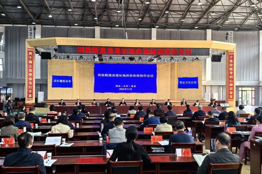 人民政协报社编委、文化副刊部主任、高级编辑王晓宁表示,弘扬包括儒家思想在内的中华优秀传统文化、推动不同文明互学互鉴是习近平文化思想的重要组成部分。召开周敦颐遗迹遗址地政协协商协作会议和周敦颐理学文化学术研讨会,进一步弘扬了以周敦颐及其理学思想为代表的中华优秀传统文化的影响力;通过周敦颐遗迹遗址地合作,在更广范围、更高层次进行共同协商议政;借助地方文化优势“以文塑旅、以旅彰文”,为经济文化的发展贡献政协力量;持续推动周敦颐理学文化的深入研究,并将其学术成果进一步彰显出来具有重要的当代文化价值。受市委书记朱洪武的委托,侯文在讲话时指出,永州作为周敦颐的出生地、成长地、悟道地、工作地,多年来始终坚持以习近平文化思想为引领,坚持把传承发展周敦颐理学文化作为对外文化交流、促进文旅发展的重要载体,全域统筹、多方联动、高效协作,对扩大周敦颐理学文化影响力予以不遗余力的支持。特别是永州市政协,一以贯之聚焦周敦颐理学文化这个主题,持续开展“濂溪文化传承与发展”“全力扩大周敦颐世界影响力”“周敦颐遗迹遗址地政协协商协作会议”等专题调研、常委会议专题协商,通过委员大会发言、重点提案、调研报告等形式,全力推动周敦颐研究日渐走深、思想传播更加多元广泛、活化利用更见成效。谢景林在主持中表示,召开周敦颐遗迹遗址地政协协商协作会议旨在深入学习贯彻习近平文化思想,加强周敦颐遗迹遗址地政协沟通交流、协商合作,进一步发挥政协凝聚共识、汇聚力量的重要作用,为传承发扬周敦颐理学文化价值,促进文旅融合发展,扩大周敦颐理学文化世界影响力助力添彩、贡献力量。这次会议对我们周敦颐遗迹遗址地各政协进一步提升协商协作实效,更好助推周敦颐理学文化传承发展具有重要意义。“永州倡议”的通过标志着周敦颐遗迹遗址地政协协商协作进入全面推进落实阶段,是本次会议的重要成果,将为传承千年文脉,弘扬周敦颐理学思想文化书写浓墨重彩的政协篇章!昨天的预备会议,还共同签署了《周敦颐理学文化城市联盟章程》,正式成立了周敦颐理学文化城市联盟,同时也欢迎更多政协组织、研究机构和专家学者加入联盟大家庭,共同推动周敦颐理学文化研究发展。会议还观看了专题片《讲好濂溪故事 坚定文化自信——周敦颐遗迹遗址地政协协商协作会议》,播放了清华大学国学研究院院长,中国哲学史学会名誉会长、国际儒学联合会副理事长陈来、湖南省委宣传部原巡视员、省社科联原主席、湖南师范大学教授郑佳明专家视频发言。永州市政协党组副书记、副主席桂砺锋,郴州市政协党组成员、副主席周汶,九江市政协副主席、民进九江市委会主委陈保平,合川区政协副主席、民革合川区工委主任李文莉,道县县委书记唐超学现场发言,其他地市书面发言。会议还协商通过“永州倡议”(草案)。