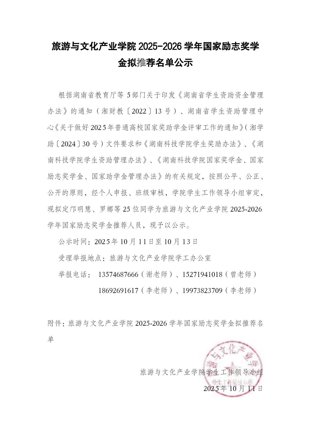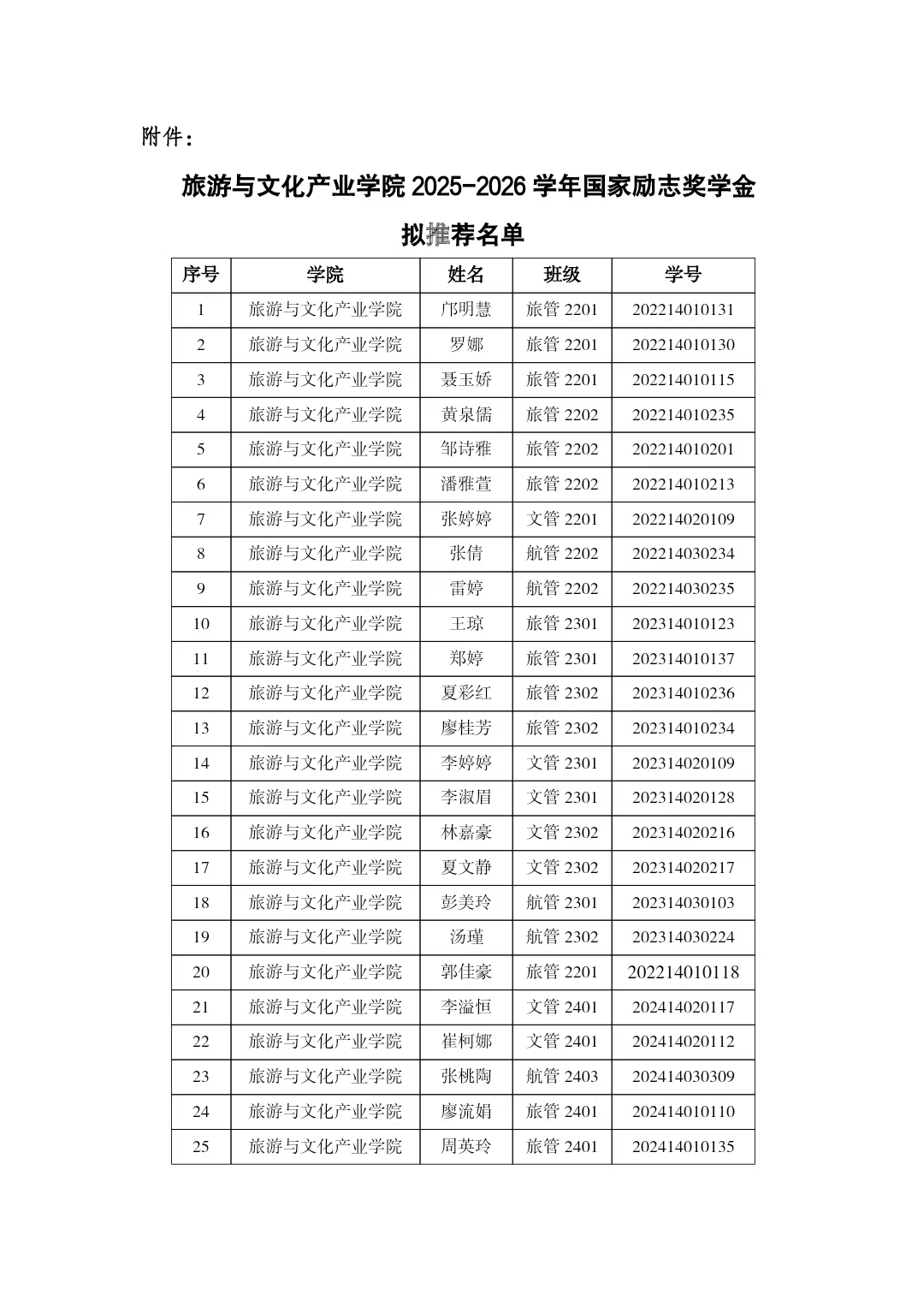 旅游与文化产业学院2025-2026学年国家励志奖学金拟推荐名单公示
