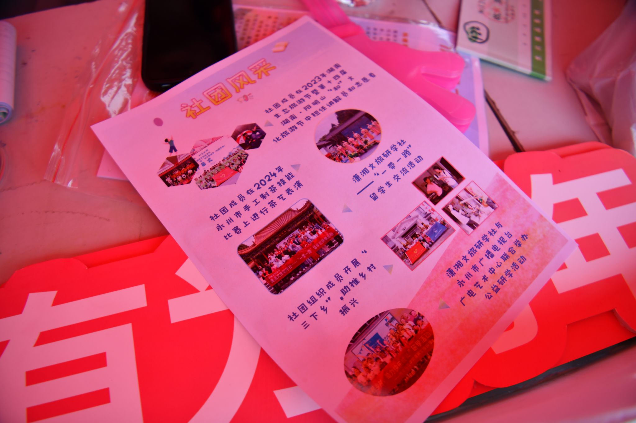 潇湘文旅研学社将各式特色文创产品铺展开来,社员们以热情的笑脸与细致的讲解,与志趣相投的新生畅谈旅行与研学之乐。不远处,九嶷古琴社琴音潺潺,身着传统服饰的社员现场演奏,风雅尽显。许多同学被清越琴声吸引,并在社员指导下亲手拨弦,体验穿越千年的音律之美。