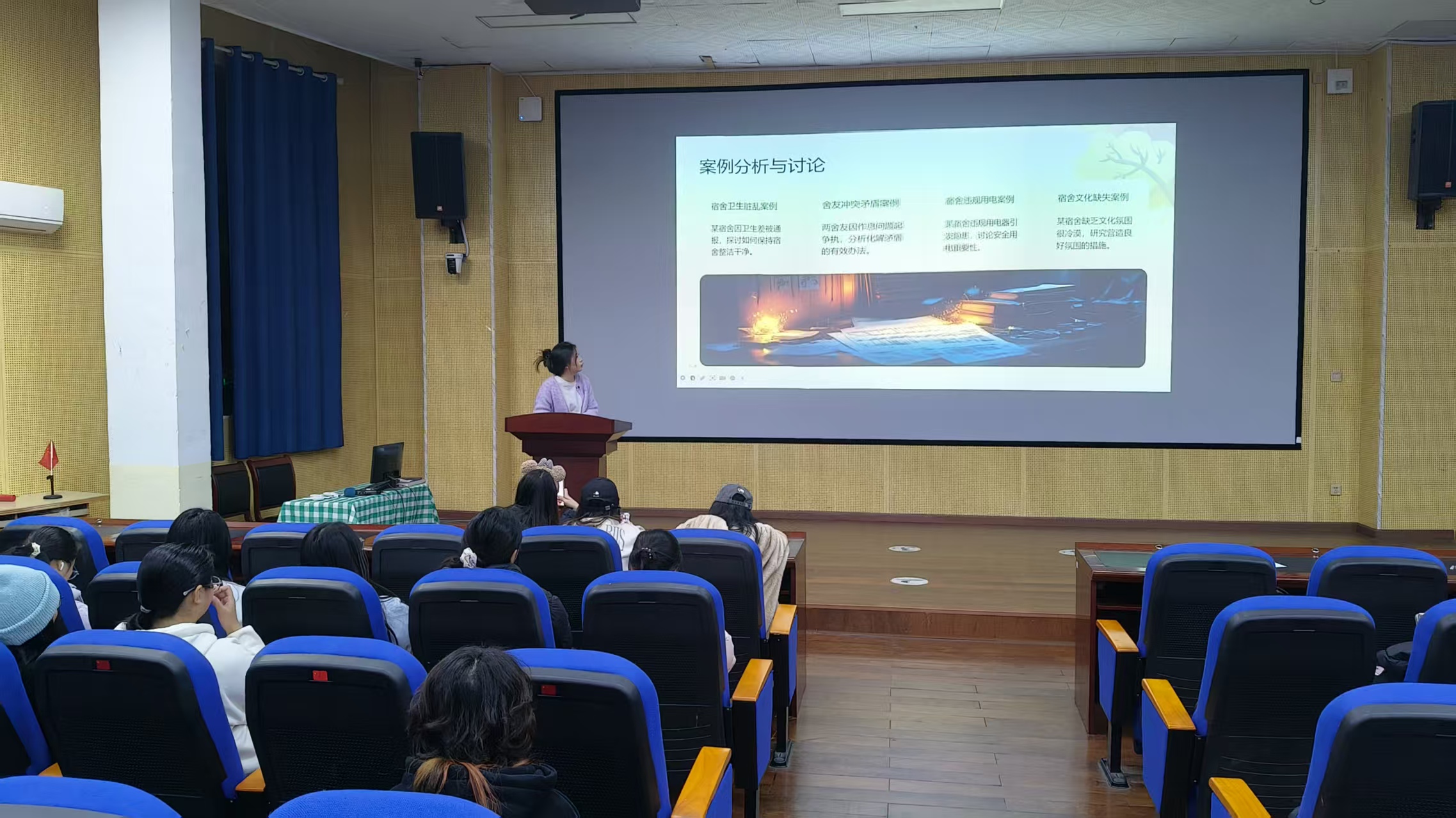 据悉,本次讲座由学校学生工作处主办、旅游与文化产业学院承办,活动内容紧密贴合学生宿舍生活实际,精准聚焦宿舍相处中的核心问题,从公共礼仪、室友交往礼仪、安全礼仪三大核心维度系统展开。主讲嘉宾立足校园真实案例,用通俗易懂的语言,深入浅出地讲解了宿舍卫生清洁分工、作息时间协调、有效沟通技巧、规范用电准则等实用知识。讲座过程中,嘉宾巧妙穿插趣味互动提问环节,打破传统宣讲的沉闷感,让同学们在轻松愉悦的氛围中深化对礼仪规范的理解与认同。