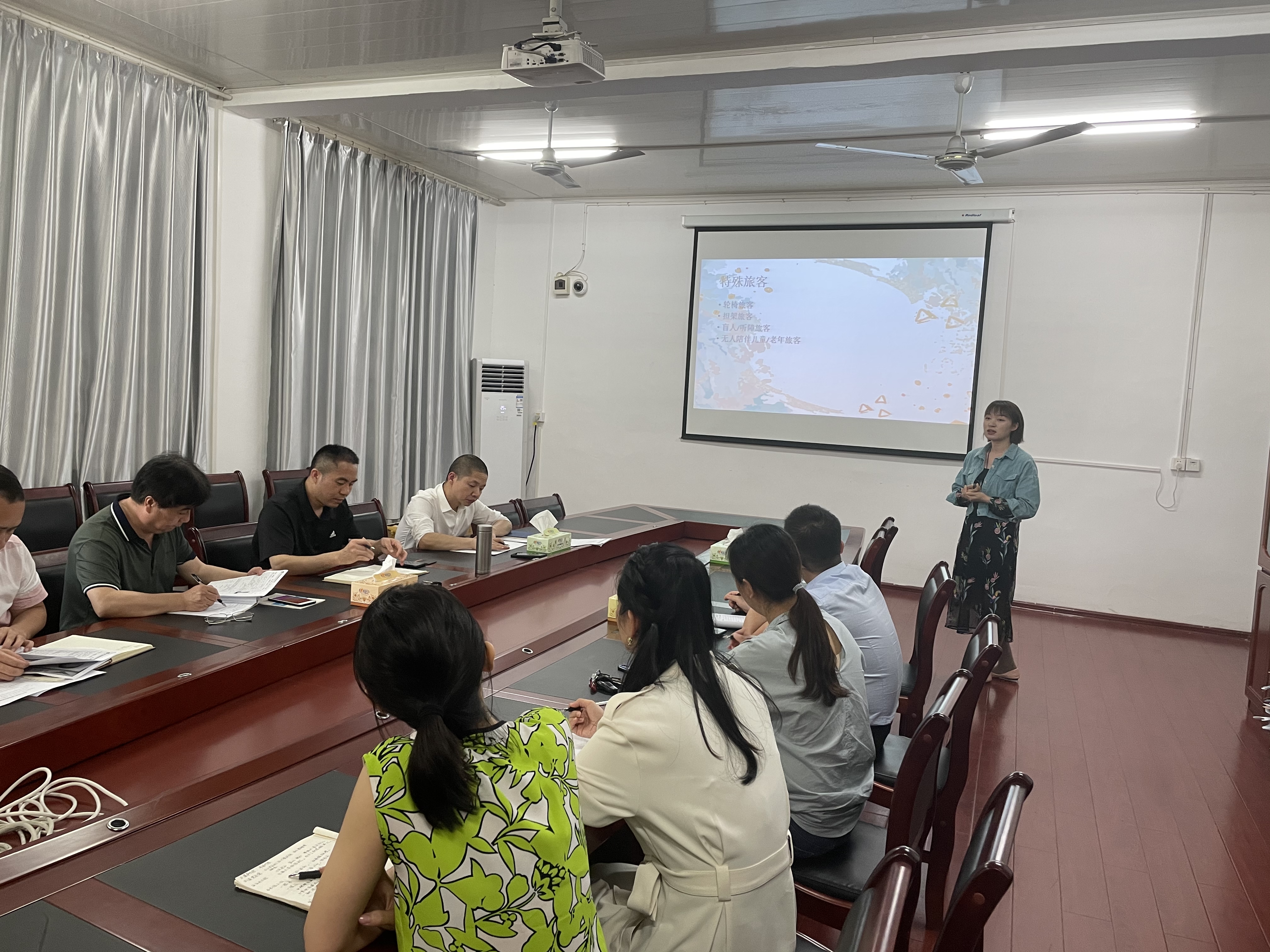 本网讯(通讯员 陈毓璐) 5月10日下午,学院航空服务艺术与管理专业教研室、北京广慧金通教育科技有限公司企业驻校办公室联合举办教学活动,在荟英楼306室组织新入职专任老师试讲。学院院长黄渊基,党总支书记杨再喜,党总支副书记、副院长潘清远,副院长姚先林,航空服务艺术与管理系主任蔡保忠以及旅游管理系主任李晓红等领导、老师全程参与并指导,北京广慧金通驻湖南工作处主任徐蕾,企业驻校辅导员陈毓璐参加并交流。