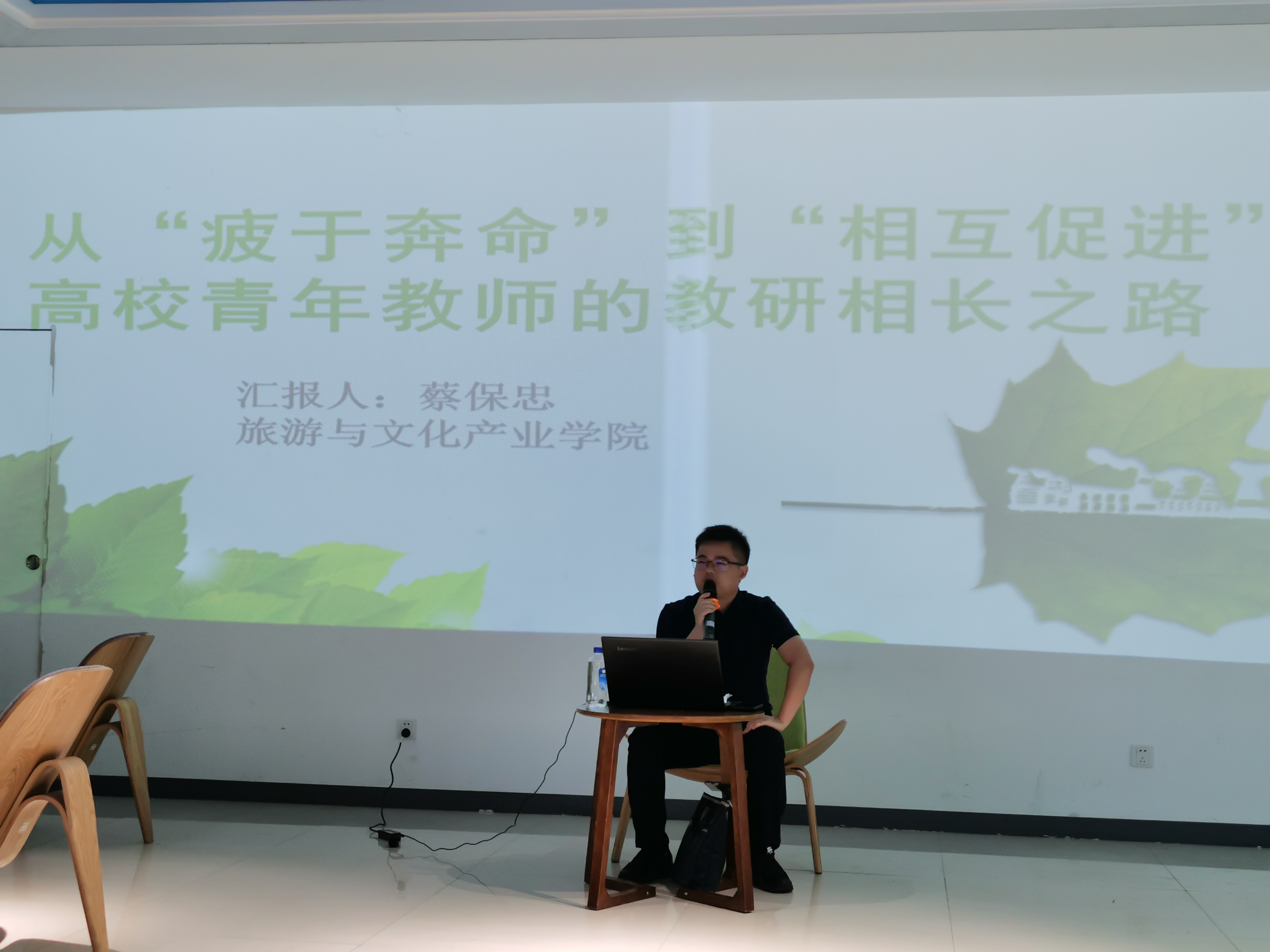 本网讯(通讯员 蔡保忠) 6月22日下午,以“从‘疲于奔命到‘相互促进’:高校青年教师的教研相长之路”为主题的教师发展活动在beat365中文官方网站创新创业大楼一楼创客工场举行。本次活动由教学质量管理处(教师发展中心)主办,旅游与文化产业学院承办。我院蔡保忠博士担任主讲人,活动由学院副院长姚先林主持。