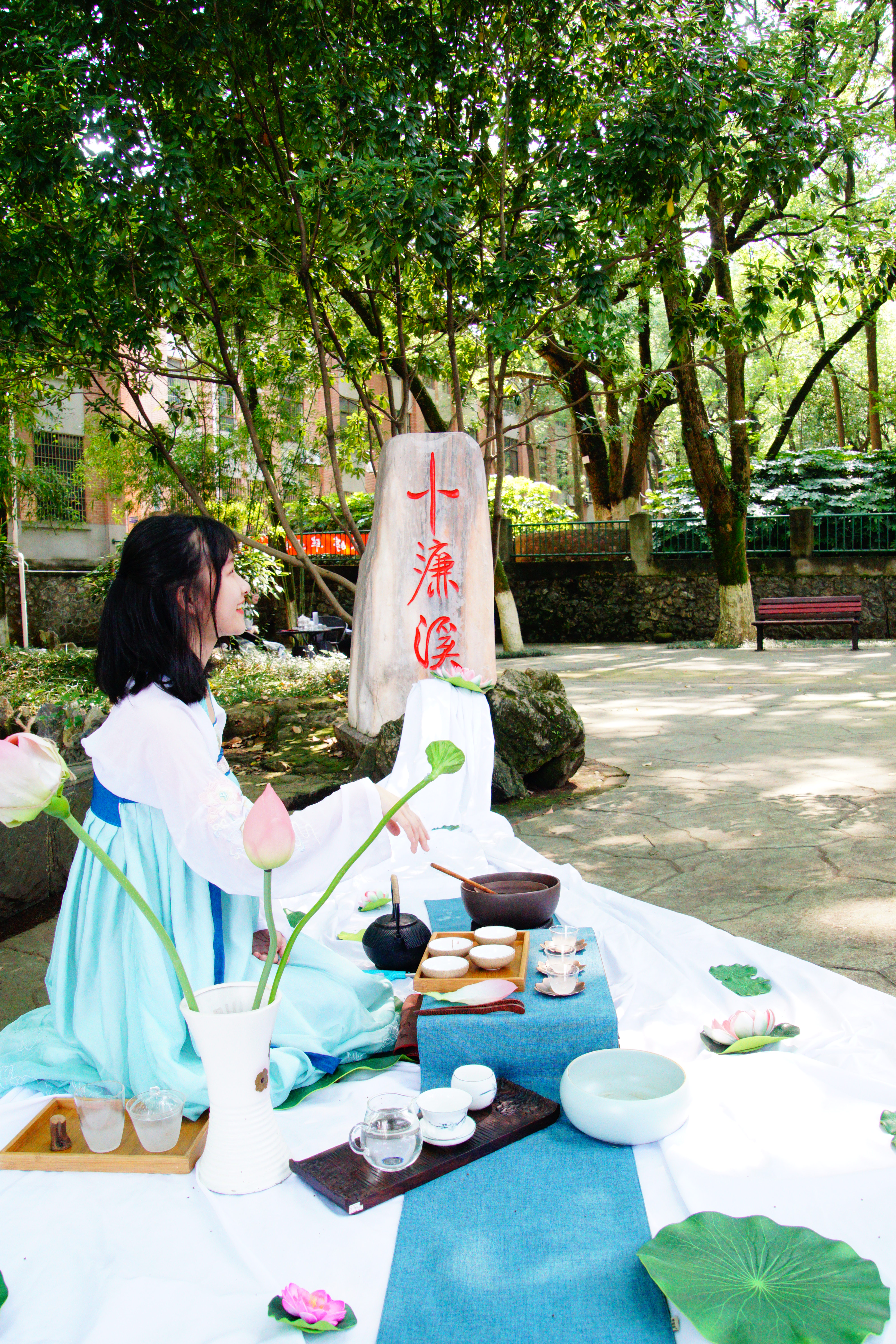 参加赏茶、品茶的师生、游客跟随着任课老师刘幼平的脚步,陶醉于每个主题的讲解。理学鼻祖周敦颐,湖南永州人,世称濂溪先生,学生根据理学文化创意了濂溪茶礼主题,该主题结合了《爱莲说》《太极图说》中的有关内容,如茶叶是莲花窨的白茶,冲泡时以左手注水,右手出汤,是为左右协调,阴阳平衡。”“这套茶具与女书文化结合在了一起,茶具是在景德镇个性化定制的,上面的文字是极具代表性的江永女书。”“‘绿肥红瘦以娥皇女英与舜帝的爱情故事为线索,绿色的抹茶,配以阳明山杜鹃红,便有了杜鹃泣血红,声声唤君归的意境。