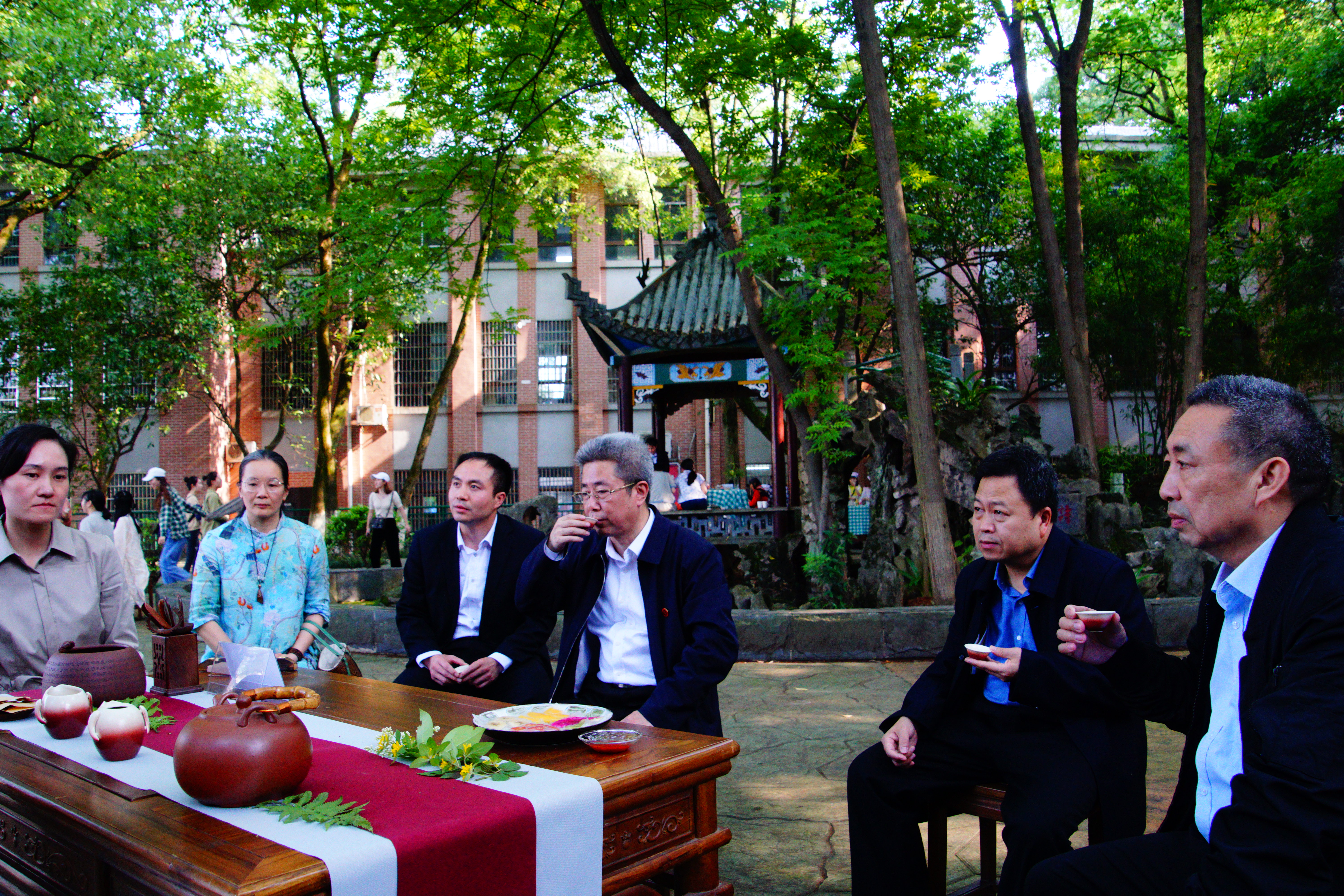 濂溪茶礼、文人墨客、研磨竹间、绿肥红瘦、罗织红纱等主题茶艺展示引来了众人的驻足和称赞。510日下午,旅游与文化产业学院依托专业课程举办的主题茶会暨毕业生欢送活动在荟英楼后花园举行。学校党委书记、校长曾宝成,党委委员、副校长李常健,教务处长黄文,实验实训中心主任魏大宽,团委书记刘佳,学院院长黄渊基、党总支书记李年终及2019届毕业生、2016级学生等参加了茶会。