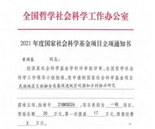近日,全国哲学社会科学工作办公室下发了2021年度国家社会科学基金项目立项文件,我院黄渊基教授的《民族地区文旅融合发展促进脱贫巩固和乡村振兴研究》成功获得立项。这对于提升学院学科建设水平、引领科研发展,支撑专业建设,打造高水平师资团队等具有十分重要的意义。