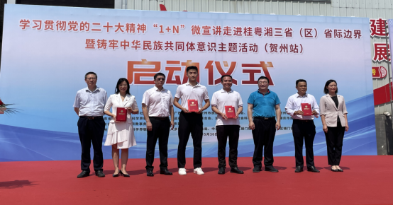 530日上午,学习贯彻党的二十大精神“1+N”微宣讲走进省际边界暨铸牢中华民族共同体意识主题活动启动仪式在贺州市八步区铺门镇举行,贺州市社科联主席杨剑华宣布活动启动,贺州市民宗委主任向云宣读桂粤湘三省(区)省际边界铸牢中华民族共同体意识倡议书,八步区委常委、宣传部长覃远军致辞。活动现场,广西贺州、湖南永州、广东清远、肇庆四市宣讲员代表用通俗易懂的语言及身边的事例,深入浅出地向基层群众宣传阐释党的二十大精神。黄渊基院长获发党的二十大精神1+N”微宣讲桂粤湘三省(区)四市优秀宣讲员荣誉证书,并在烈日下为当地父老乡亲分享了一场生动鲜活的理论微宣讲,用“小切口”讲述民族团结“大道理”,引导各民族同胞进一步铸牢中华民族共同体意识,凝聚广大干部群众干事创业谋发展的强大精神力量,受广大群众欢迎。