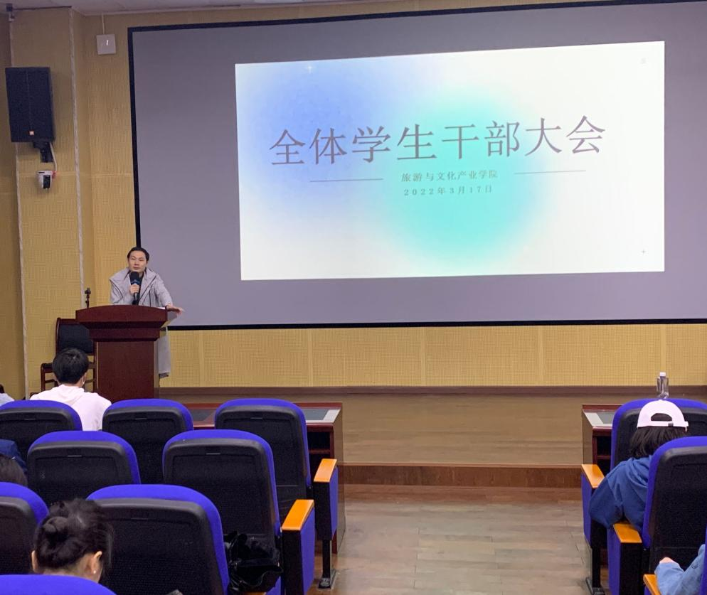 最后,肖可就学院2022年学生总体工作进行了部署首先解读了《旅游与文化产业学院2022年学生工作计划》,并就上次会议布置工作的落实情况进行总结。进而提出学习部、纪检部要进一步加强学风建设,宿管部要就宿舍违纪开展专项整治行动。最后,提到心理健康部5.25的活动方案和红色朗诵比赛都需提前做好准备。