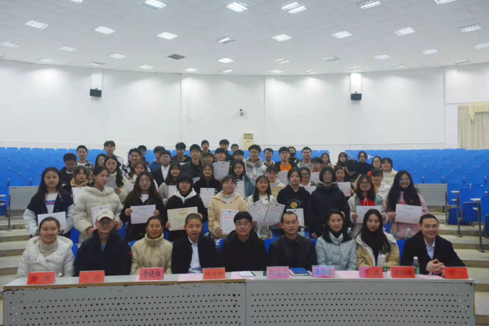 本次大会共有七项议程:12月13日为南京大屠杀死难者国家公祭日,首先,全体同学起立为纪念南京大屠杀受难同胞默哀一分钟。大会第二项议程为诚信考试动员,潘清远书记宣读了考试纪律与相关文件,并温馨提醒同学们要做好复习迎考准备。学生代表肖时发发言,呼吁大家诚信考试,毛德带领全院学生进行了诚信考试宣誓。大会第三项议程新老团总支副书记分别就团委工作的进行了总结与规划和为已卸任的学生干部颁发聘书。大会第四项议程进行运动会、学习强国及读书系列活动表彰,优秀运动员代表李海和邹可心同学依次进行发言鼓励同学们多健身、多为学院做贡献,到场嘉宾老师为各类获表彰的同学、班级颁奖。大会第五项议程,为增强学生防艾意识,提高学生自我保护能力,观看了防艾宣传视频。大会第六项议程,潘清远书记就人身、财产、网络、消防、交通等方面的安全工作进行了强调。大会第七项议程,党总支书记杨再喜对大会进行总结发言,并表达对全院学生的希冀与鼓励。