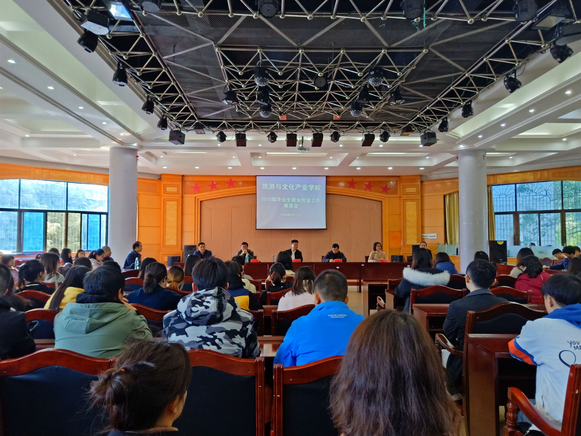 本网讯(通讯员 尹遥)311日下午,我院在明德楼200报告厅开展了2015级毕业生就业创业工作座谈会。校党委委员、副校长程智开,就业创业指导中心直属党支部书记陈旭日,欧利豪廷酒店总经理姜炳钊,同程亲和力旅游永州公司总经理周觅君,永州市拓普物业发展有限公司总经理卿斌出席。学院党总支书记李年终主持,我院2015级毕业生参加会议。