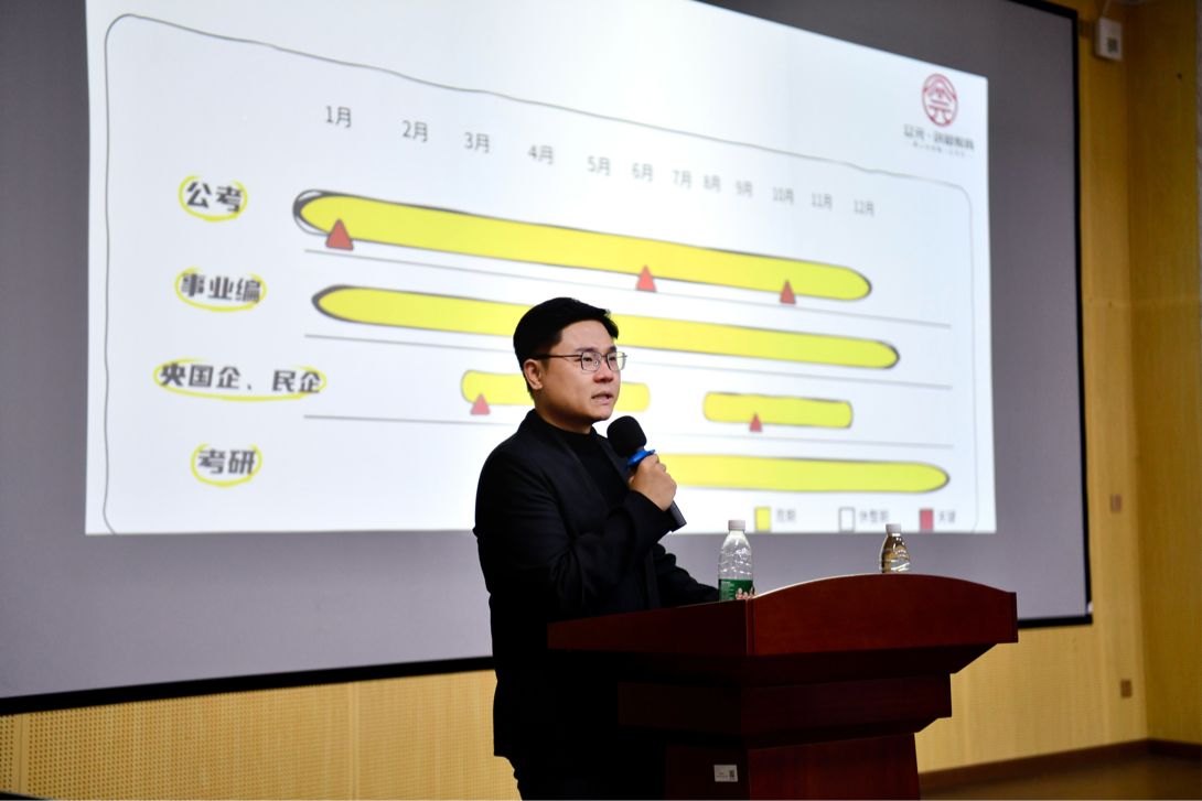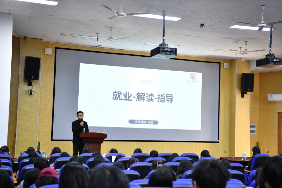 本网讯通讯员:杨树 周林馨雨)为帮助学生精准把握就业形势,科学规划职业发展路径,4月1日1530分,旅游文化产业学院在博雅楼西三报告厅召开2025届就业指导宣讲活动。会议特邀众元创知教育创始人刘育辰老师主讲,旅文院大三全体同学及大二学生代表参会,共同围绕就业创业、职业规划等核心议题展开深入交流。