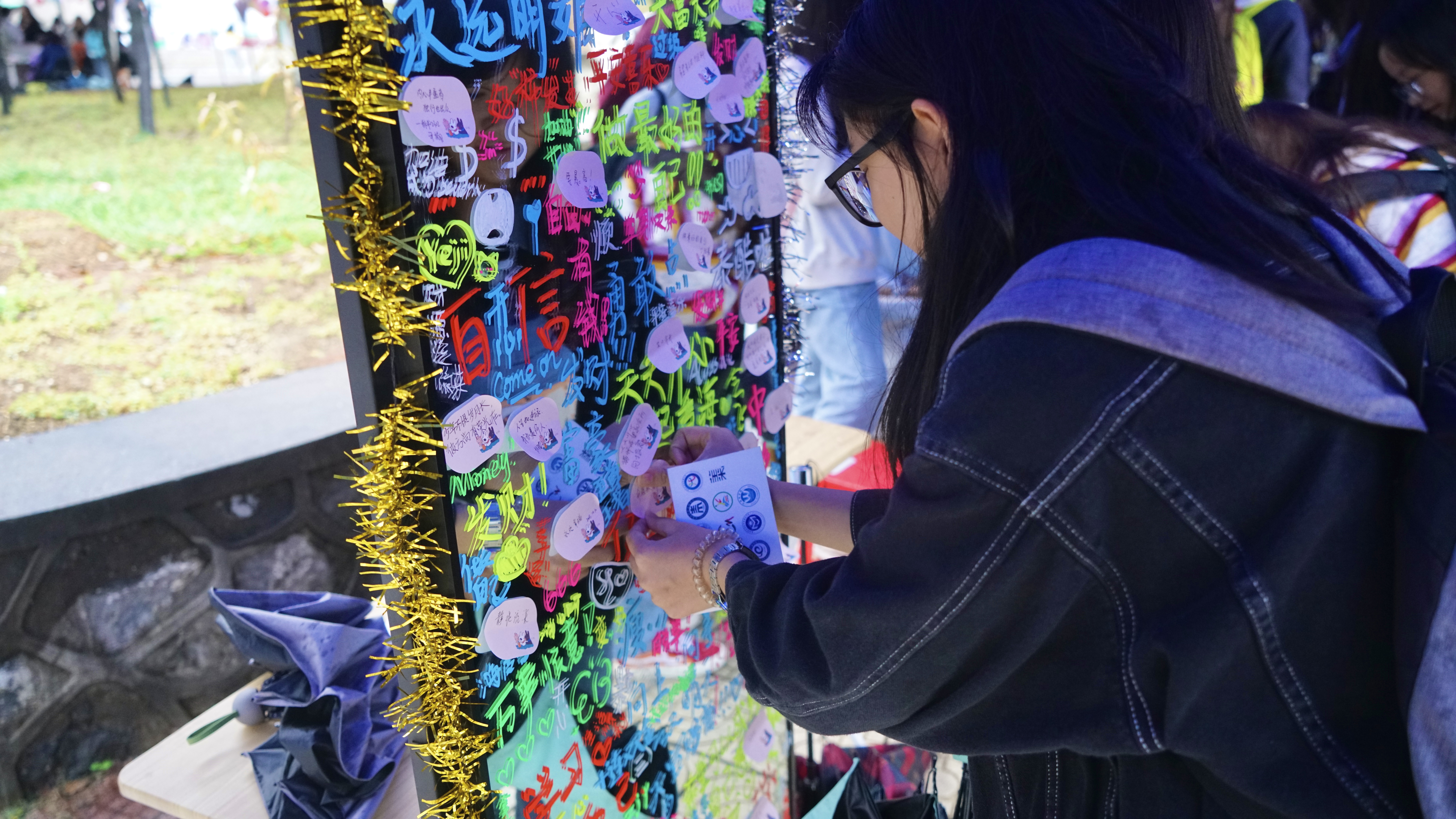 活动现场,除了指背猜字、听词唱曲和逛三园等小游戏,还有深受同学们喜爱的灵犀之镜照见真我”创意环节,参与的同学们纷纷在镜前驻足,用彩色的马克笔在镜子上留下美好祝福,不出片刻,镜子上已被“自信、快乐、做自己、勇敢”等积极向上的字眼填满,传递出自爱、自信、自强”的正能量。除此之外,本次还有突出专业特色小游戏——“女书情韵”。此游戏通过记忆、辨认女书文字来宣传女书文化,这不仅展现了永州当地的独特文化特色,传递出积极向上、健康乐观的精神,也为传播女书文化和女书精神、促进地方文旅事业发展做出努力。