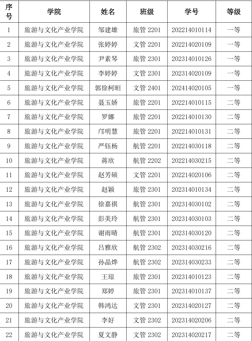 根据学校《关于开展beat365官网 2025 年奖助学金评审工作的通知》以及《beat365中文官方网站学生奖励办法》、《beat365中文官方网站学生资助管理办法》的有关规定,按照公平、公正、公开的原则,经个人申报、班级审核推荐,学院学生工作领导小组审定,现拟定旅管 2201 班邹建雄