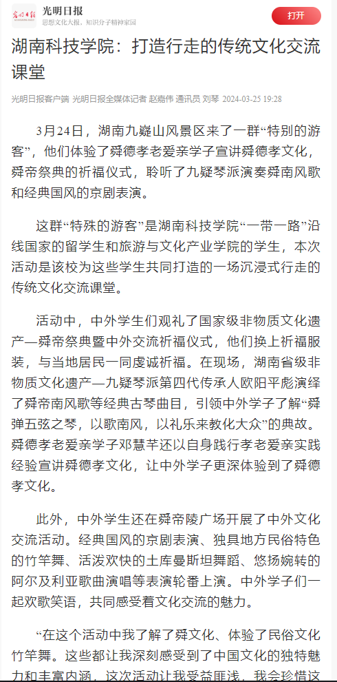 活动中,中外学生们观礼了国家级非物质文化遗产—舜帝祭典暨中外交流祈福仪式,他们换上祈福服装,与当地居民一同虔诚祈福。在现场,湖南省级非物质文化遗产—九疑琴派第四代传承人欧阳平彪演绎了舜帝南风歌等经典古琴曲目,引领中外学子了解“舜弹五弦之琴,以歌南风,以礼乐来教化大众”的典故。舜德孝老爱亲学子邓慧芊还以自身践行孝老爱亲实践经验宣讲舜德孝文化,让中外学子更深体验到了舜德孝文化。