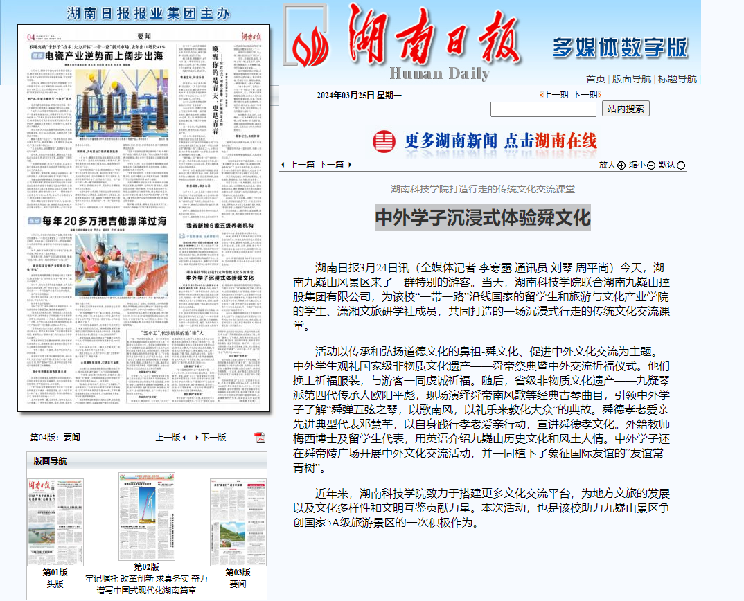 活动以传承和弘扬道德文化的鼻祖-舜文化、促进中外文化交流为主题。中外学生观礼国家级非物质文化遗产——舜帝祭典暨中外交流祈福仪式。他们换上祈福服装,与游客一同虔诚祈福。随后,省级非物质文化遗产——九疑琴派第四代传承人欧阳平彪,现场演绎舜帝南风歌等经典古琴曲目,引领中外学子了解“舜弹五弦之琴,以歌南风,以礼乐来教化大众”的典故。舜德孝老爱亲先进典型代表邓慧芊,以自身践行孝老爱亲行动,宣讲舜德孝文化。外籍教师梅西博士及留学生代表,用英语介绍九嶷山历史文化和风土人情。中外学子还在舜帝陵广场开展中外文化交流活动,并一同植下了象征国际友谊的“友谊常青树”。