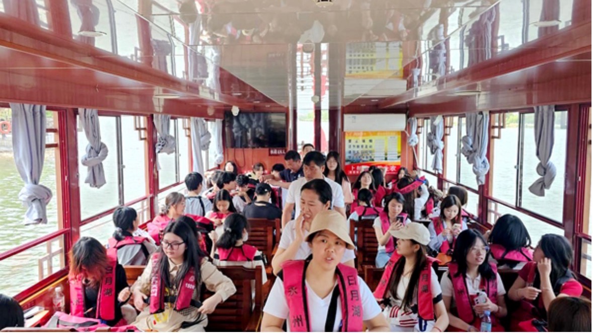 移步花千谷·月湖景区,师生们认真听取导游讲解,在湿地科普馆了解各类花卉草木的特性与生长环境,将理论知识与实际观察紧密结合。在游船上,大家深入探讨如何将自然景观与文化创意、旅游体验更好地融合。