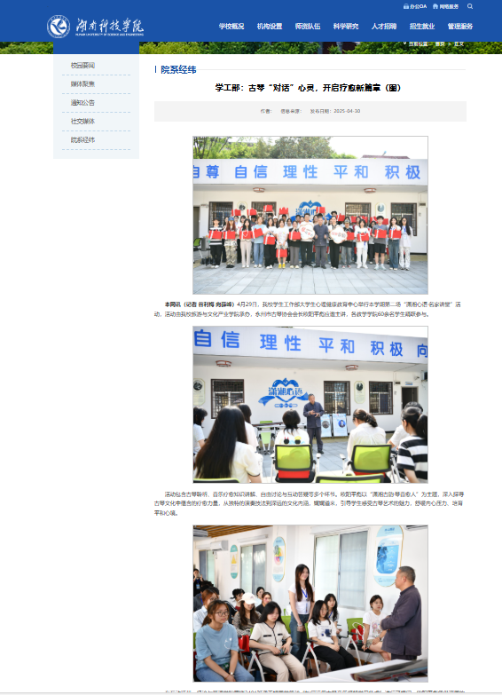 活动包含古琴聆听、音乐疗愈知识讲解、自由讨论与互动答疑等多个环节。欧阳平彪以“潇湘古韵·琴音愈人”为主题,深入探寻古琴文化中蕴含的疗愈力量,从独特的演奏技法到深远的文化内涵,娓娓道来,引导学生感受古琴艺术的魅力,舒缓内心压力、培育平和心境。
