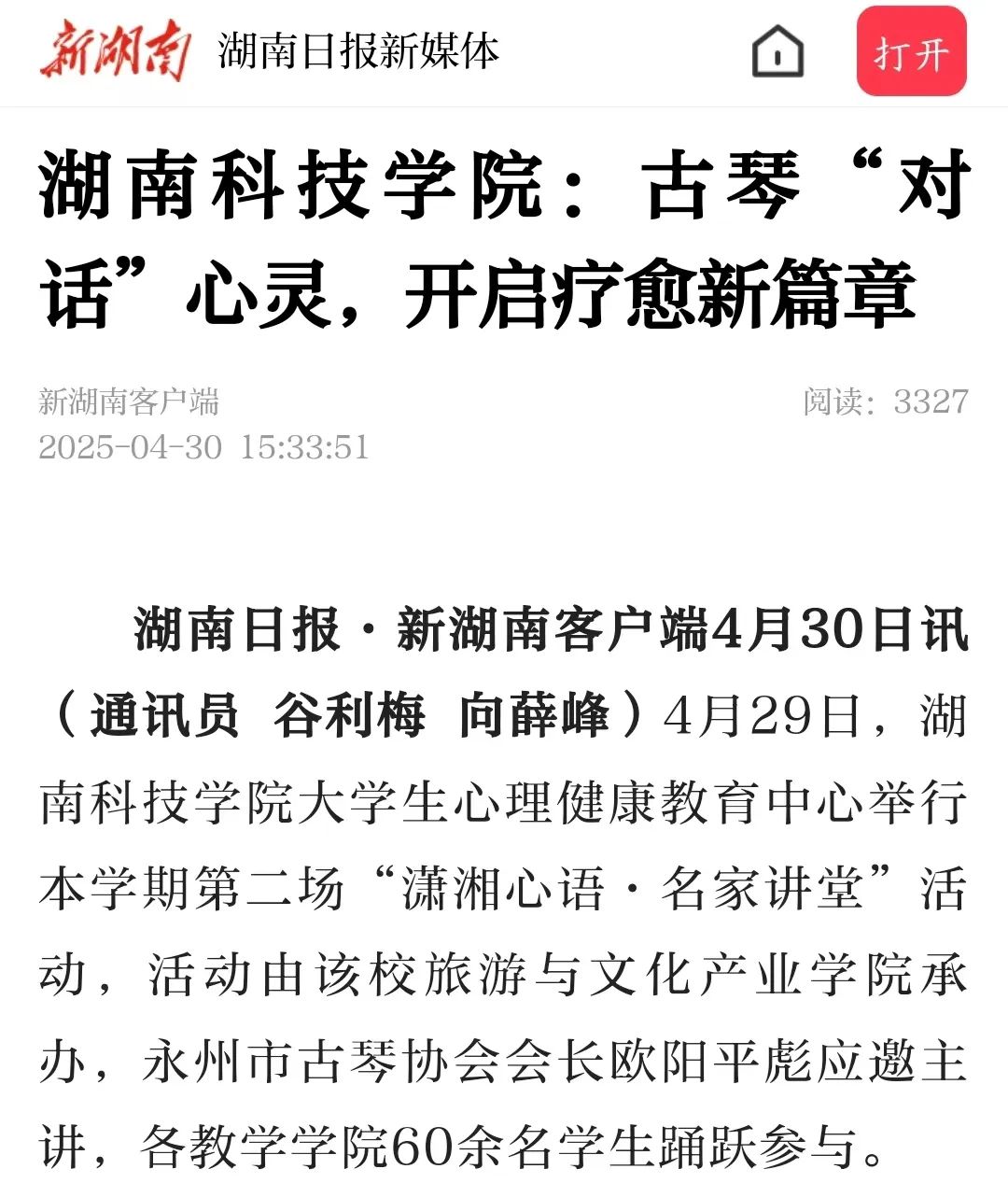 (湖南日报·新湖南客户端4月30日讯)4月29日,beat365中文官方网站大学生心理健康教育中心举行本学期第二场“潇湘心语·名家讲堂”活动,活动由该校旅游与文化产业学院承办,永州市古琴协会会长欧阳平彪应邀主讲,各教学学院60余名学生踊跃参与。