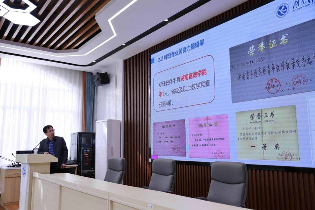 高海峡就物理学专业建设情况向各位专家进行了汇报,详细介绍了专业建设的目标、举措、成效以及未来的发展规划。