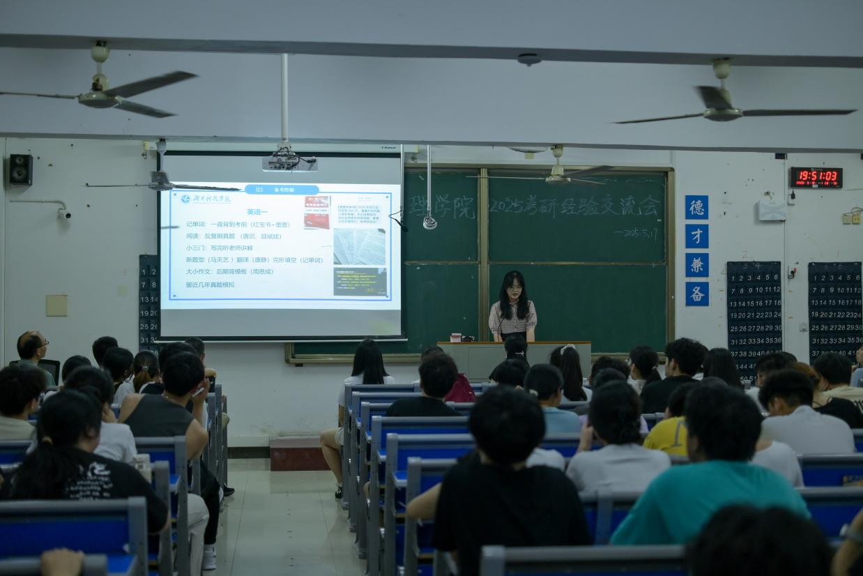 交流会伊始,院长唐耀平从“如何选定考研方向”和“定好方向后怎样去行动”这两个方面来分享经验,并用身边发生过的事例让同学们明白备考前的注意事项。随后由三位考研上岸的学姐们分享了自己的考研经验并为同学们提供了资源网站以及相关复习书籍。最后院党总支书记刘华表示“考研是磨练人意志和耐心的过程,是一场持久战贵在坚持”,一定要有信心、耐心和决心打赢这场战争。