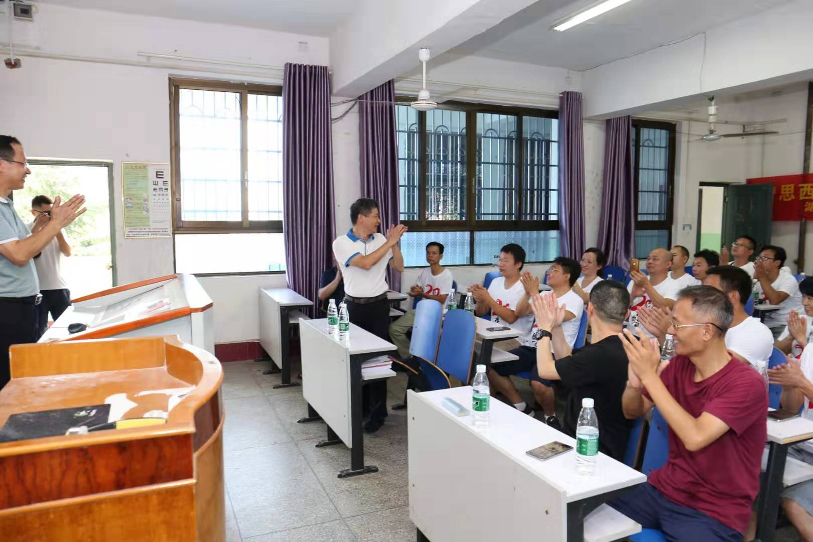 本网讯(通讯员 杜俊杰)8月1日,数学系9901班20余位校友回母校团聚,在曾经上课的明德楼302教室召开座谈会。校党委副书记唐艳明、校友总会办公室副主任雷腾、理学院党总支副书记唐卫华、理学院唐伟国副教授出席座谈会并发表讲话。座谈会由校工会常务副主席石循忠主持。