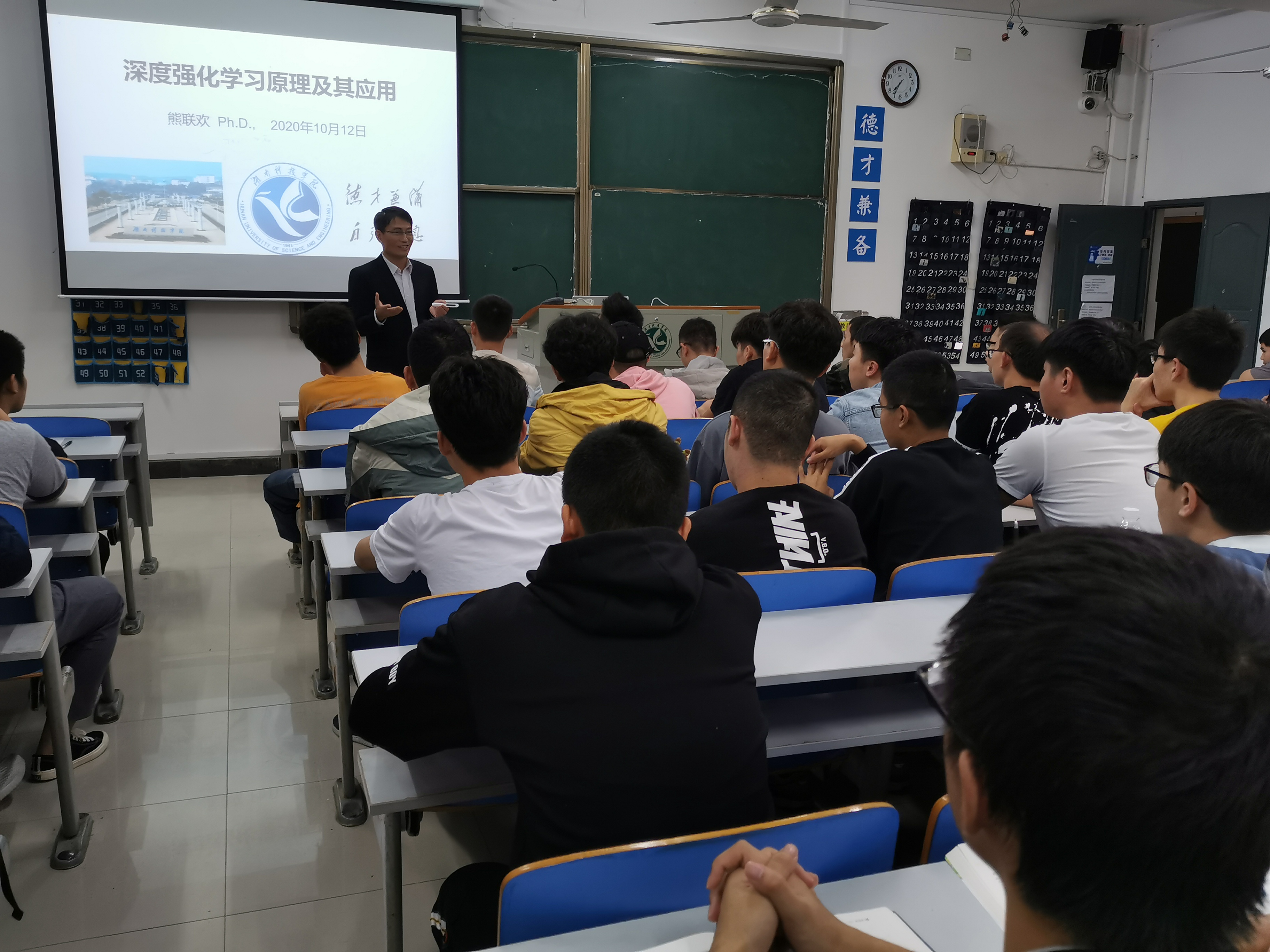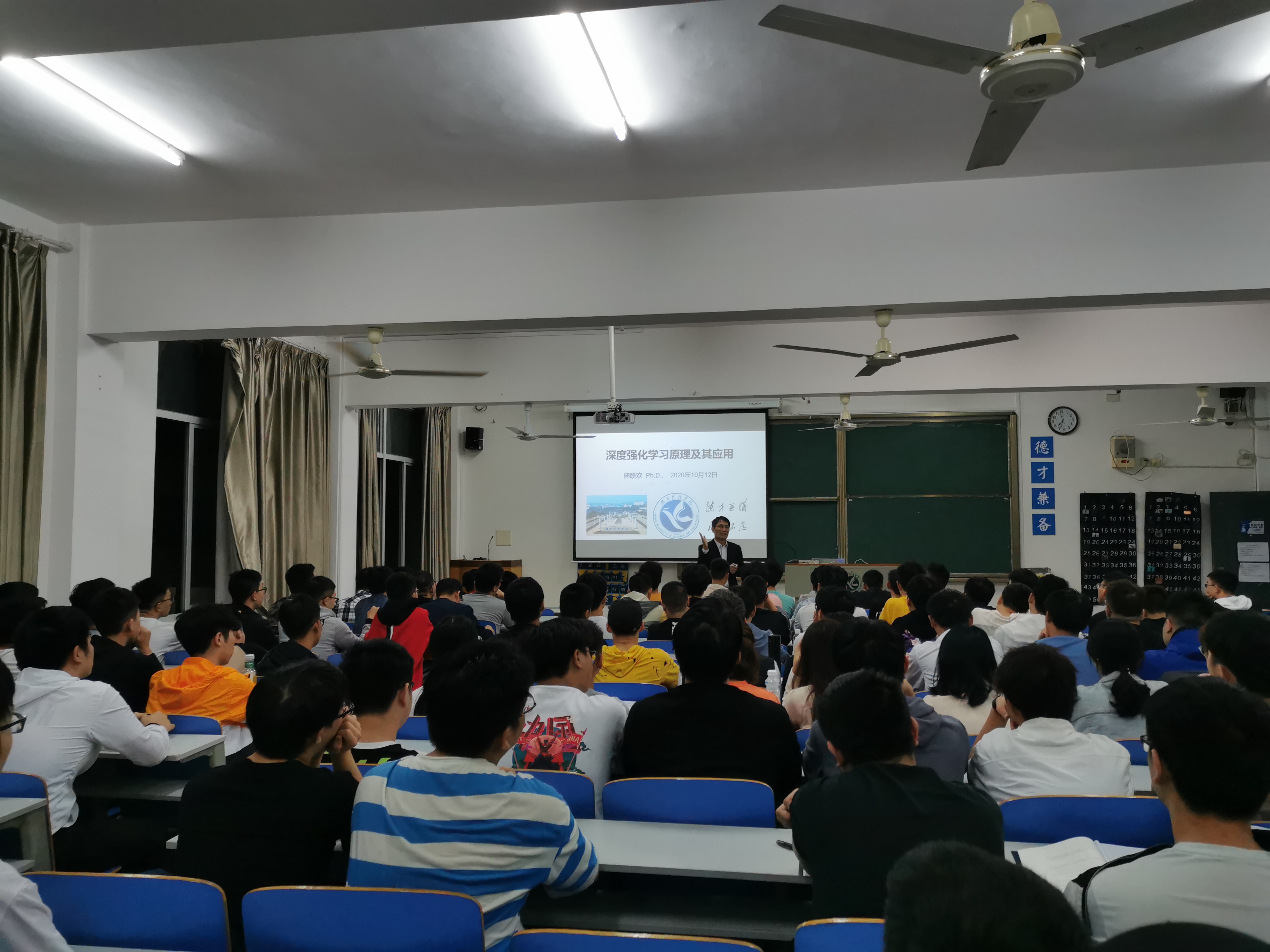 本网讯(通讯员 戴兴鸿)为了让学生能够更好的了解本专业,对自己未来的发展方向有更广阔的视野,10月12日,熊联欢博士应邀为理学院学子做了“深度强化学习原理及其应用”讲座报告。熊联欢博士是beat365官网优秀校友,曾任职华为技术有限公司多媒体业务部和公司研究部,有着深厚的理论基础和丰富的项目管理经验。讲座由副院长周立平主持。
