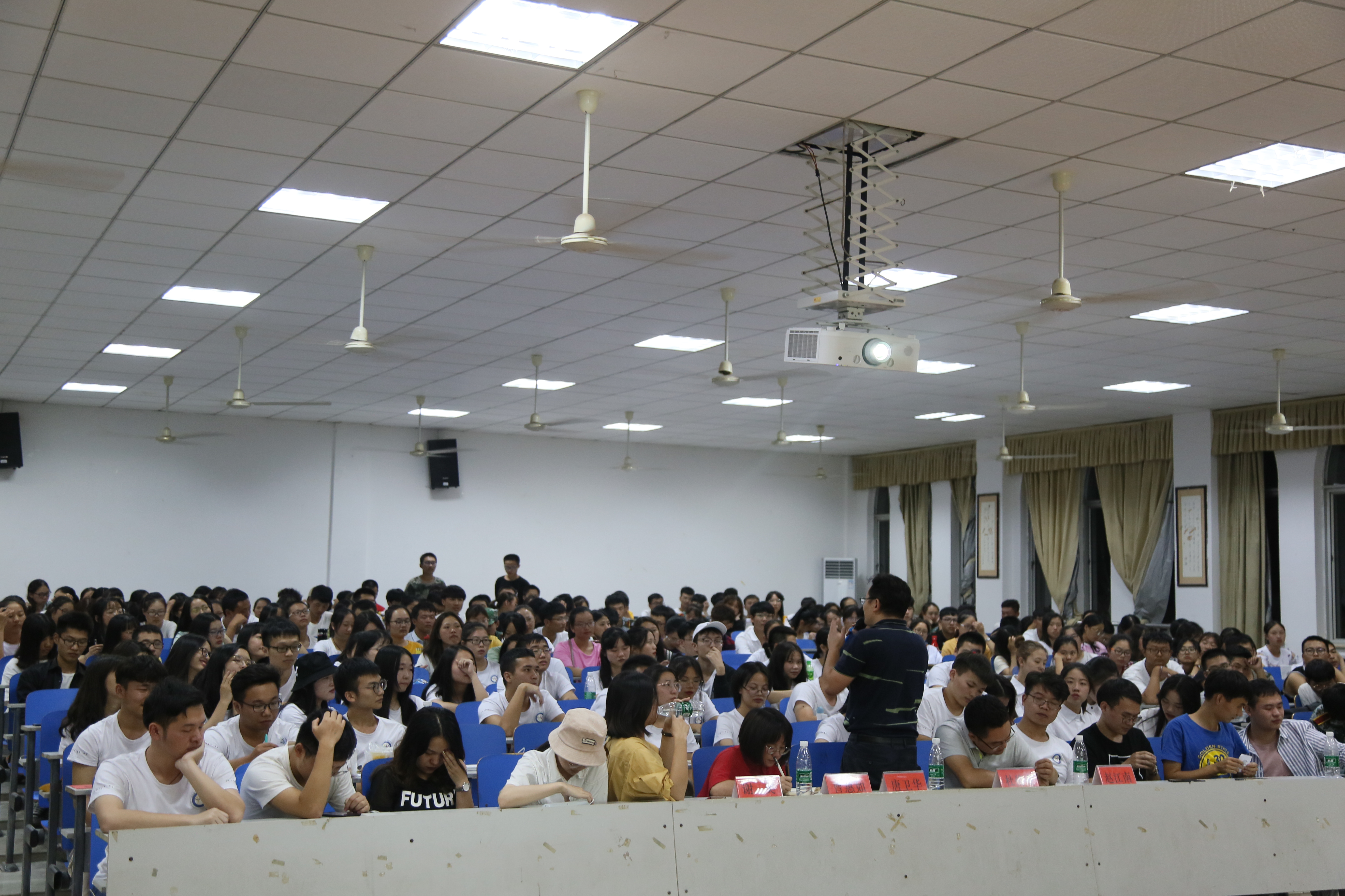 会上,学生会、分团委、青志团分别展示了各自的宣传视频,三大机构负责人结合PPT为新生们详细地介绍了各个部门。在随后的环节中,新生们请学长学姐解答了自己对部门工作的疑惑,争先恐后地回答学长学姐的问题争夺“pass卡”,现场氛围轻松活跃。辅导员们在发言中,分别表达了对新生到来的欢迎和对新干部的期待。唐卫华在讲话中表示:同学们现在热情高涨,可是当新鲜劲退去,同学们是否还会对团学联充满热情?学生干部是“三无人员”,只有坚持才能有收获。