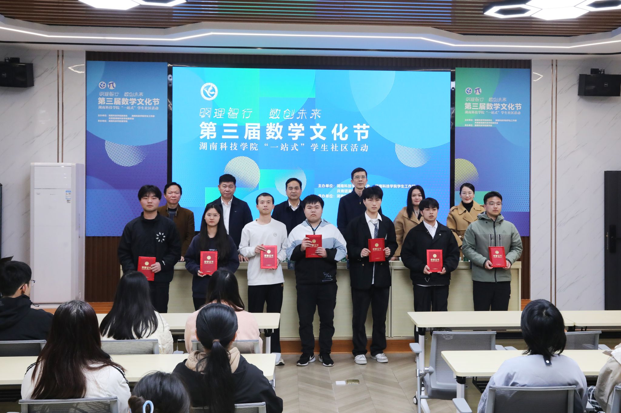 在颁奖仪式上,领导们为第十六届全国大学生数学竞赛湖南省赛区一等奖获得者王栋、黄福乾、伍佳伟、邓凯、徐明、吴涛、盛泽鑫以及2024年全国大学生数学建模竞赛国家级二等奖、湖南省赛区一等奖获奖团队代表楚磊、蒋石军、李蕾、罗晓娟、廖雪娇、石雨霏颁奖。