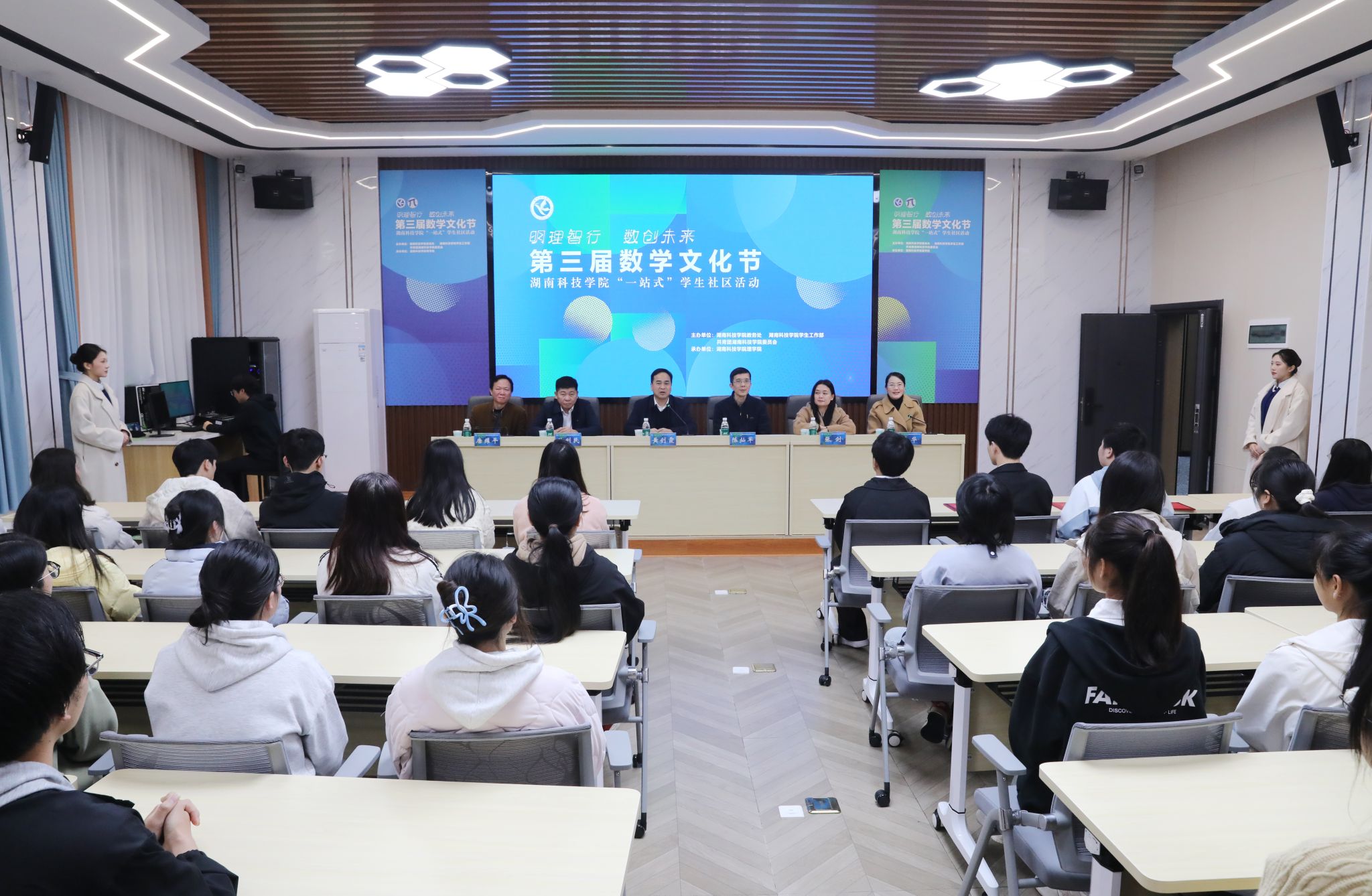 本网讯(通讯员 黄欣欣)3月14日,正值国际数学日,理学院在明理楼101举行“一站式”学生社区活动“明理智行 数创未来”第三届数学文化节开幕式。校党委副书记、校长黄创霞,党委委员、纪委书记陈灿军出席仪式,学生工作部部长谷利民,教务处处长张剑,理学院院长唐耀平参加仪式,仪式由理学院党总支书记刘华主持。