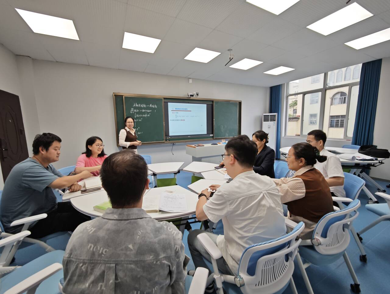 数学知识的融合路径”等议题展开研讨。省教学能手黄燕平老师指出:“课程思政不是简单‘贴标签’,而是要找准学科逻辑与育人逻辑的结合点,做到如盐化水、润物无声。”青年教师朱开心老师分享感悟:“本次示范课让我深刻体会到,数学课堂不仅能培养学生的逻辑思维,更能传递科学探索精神。”
