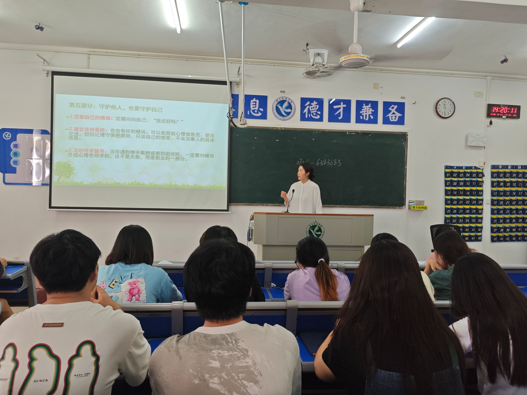 首先刘静系统阐述了心理信息员作为“观察员”“倾听员”与“宣传员”的三重角色定位,明确其工作须严格遵循保密、价值中立和量力而行三大原则。她重点讲解了身体倾听与心理倾听的技巧,指导大家如何运用共情和反馈有效开展心理支持,并介绍了校内外专业心理援助资源。此外,刘静老师特别强调自我守护的重要性,提醒各位学生干部要关注自身情绪状态、建立支持系统,做到助人与护己并重,真正成为同学心灵健康的温暖守护者。最后,欧阳素勤副书记围绕大学生心理健康现状、干预案例、危机处理流程和报告标准等多个方面进行总结。她指出学业压力、情感问题等是常见困扰,强调学生干部要关注同学情绪、行为异常及失联情况,严格保密学生隐私,及时上报干预。