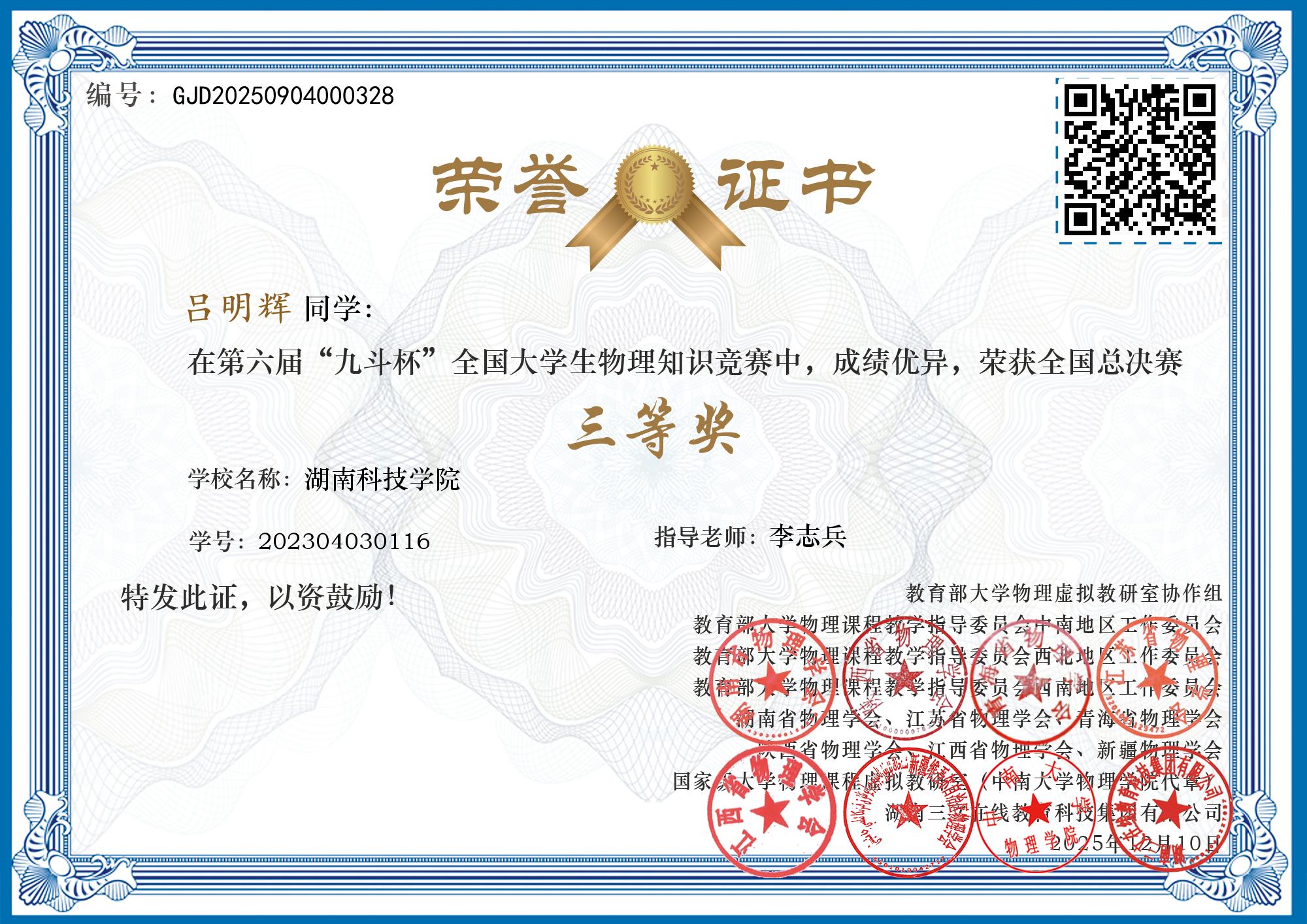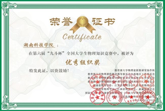网讯(通讯员 高海峡) 2025年12月13日,第六届“九斗杯”全国大学生物理知识竞赛决赛圆满落下帷幕。我院学子在本次大赛中表现优异,捷报频传:物理专业组共斩获全国三等奖3人中南赛区一等奖4人二等奖9人三等奖11人优胜奖10人,凭借出色的组织工作和突出的参赛成绩,湖南科学院荣获“优秀组织奖”,充分展现了我院在物理学科人才培养方面的深厚底蕴与卓越成效。