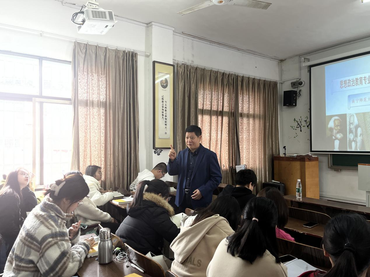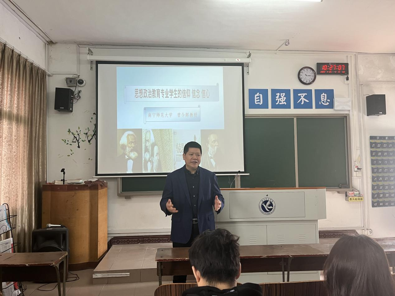 本网讯(记者 姚茹)4月25日,马克思主义学院在501召开专题讲座,邀请南宁师范大学二级教授、博士生导师、法学博士、马克思主义学院院长曾令辉对我院思想政治教育专业学生进行信仰、信念、信心微宣讲。本次讲座由我院院长廖雅琴主持。