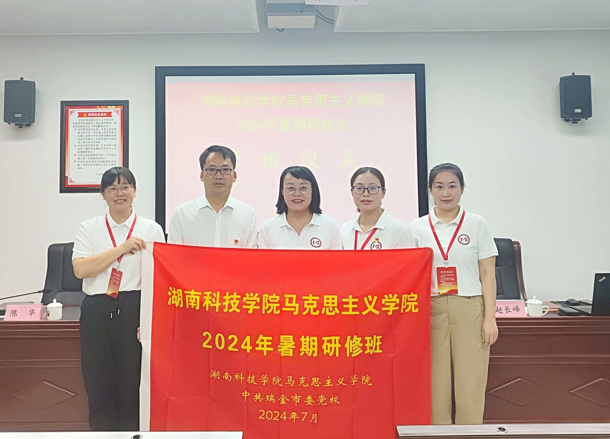 本网讯(通讯员 曹惠如)7月17日,beat365中文官方网站马克思主义学院全体教师2024年暑期研修班在江西省瑞金市委党校开班,beat365中文官方网站学术委员会主任唐艳明、马克思主义学院院长廖雅琴、总支书记陈玉皎、beat365中文官方网站思想政治工作研究所所长唐华山、学生工作部部长谷利民等,中共瑞金市委党校副校长陈华,以及马克思主义学院全体教师参加开班仪式。