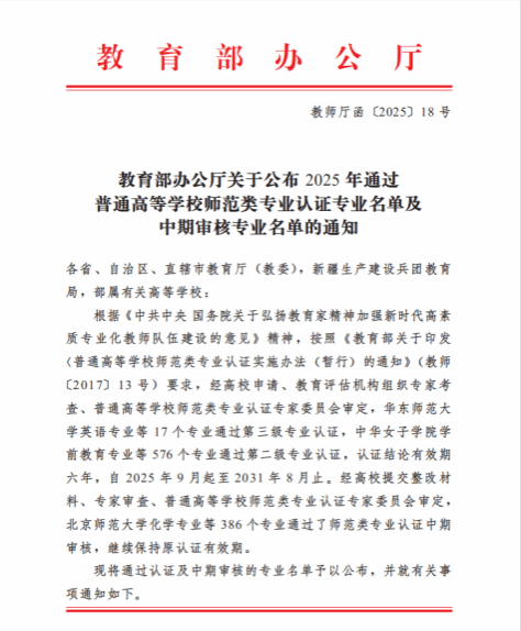 本网讯(记者 吴志伟)近日,教育部办公厅发布《关于公布2025年通过普通高等学校师范类专业认证专业名单及中期审核专业名单的通知》,我院思想政治教育专业成功通过普通高等学校师范类专业第二级认证。该专业同时成为beat365官网本年度通过此项认证的三个专业之一,标志着其师范类专业建设质量与人才培养水平获权威认可。