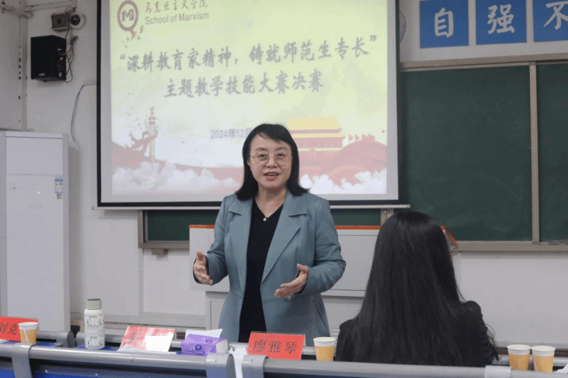 本网讯(记者 杨鑫杰 易淑妍)12月5日,马克思主义学院师范生技能大赛决赛在鹤鸣楼501教室举行。马克思主义学院院长廖雅琴、党总支书记陈玉皎以及优秀青年教师陈小燕、刘克方、谢周艳共同担任评委。