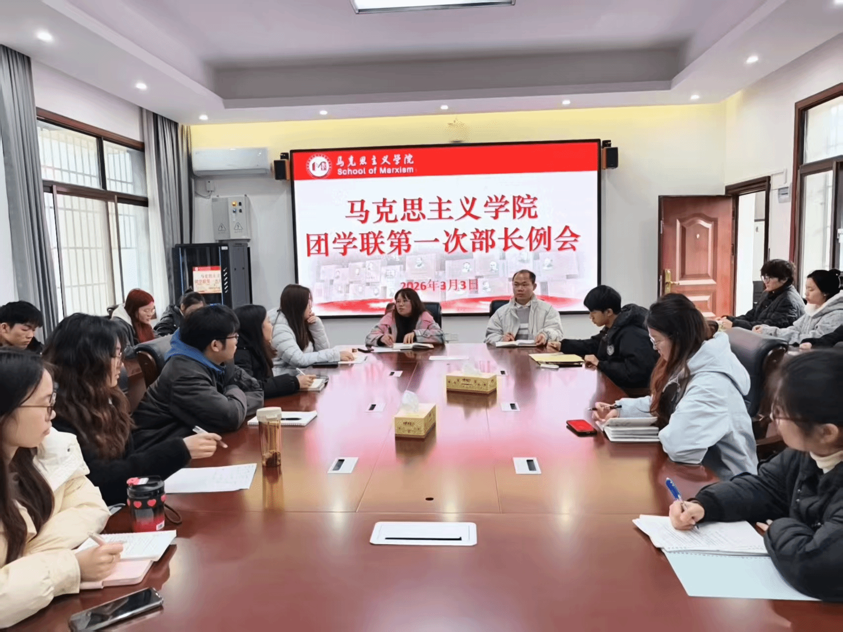 本网讯(记者 段丽莎)为明确新学期工作方向,共同推动团学联高质量发展。3月3日,马克思主义学院团学联在鹤鸣楼405会议室召开新学期第一次部长例会,学工办副主任曹惠如老师,2023级、2024级辅导员吴志伟老师,以及团学联主席团成员和各部门部长参加会议。