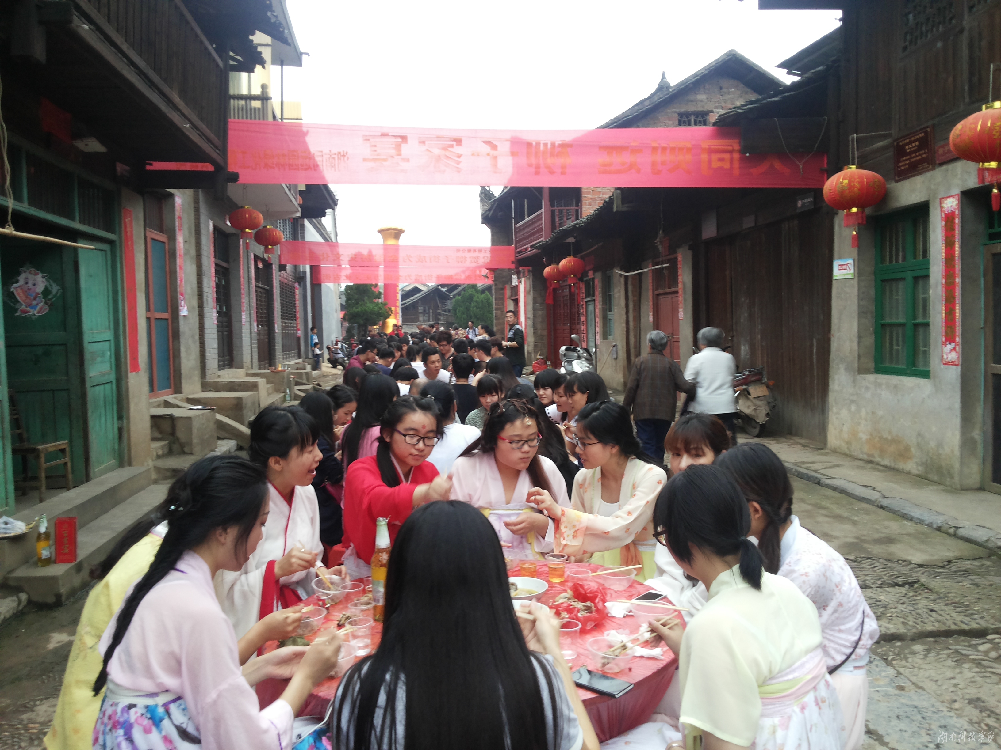 beat365官网汉服社带来舞蹈《礼仪之邦》助兴开幕表演,以汉舞演绎和诠释汉文化的内涵,让大家感受到传统文化的魅力,赢得了阵阵掌声。近半个小时的文艺演出结束后,百家宴正式开席。只见柳子古街上,一张张铺红色桌布的圆桌沿青石板街道一字排开,桌上摆满各色美味菜肴。大家品菜肴,话家常,处处洋溢着浓浓的喜庆、和谐氛围。