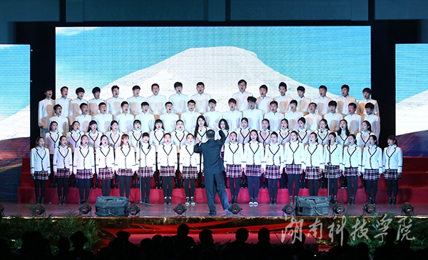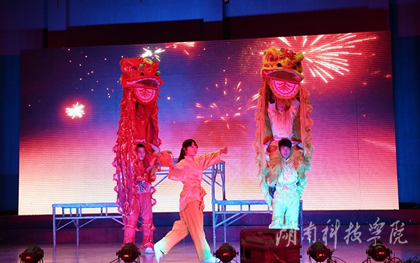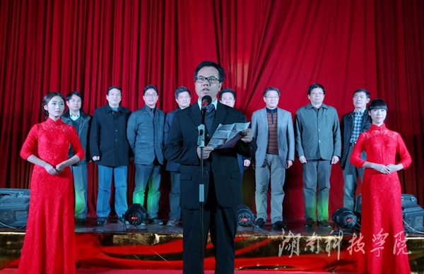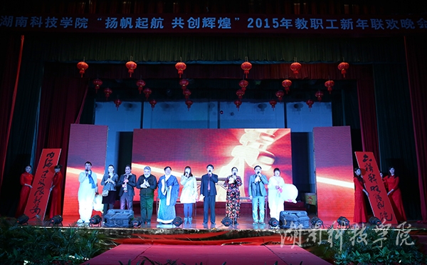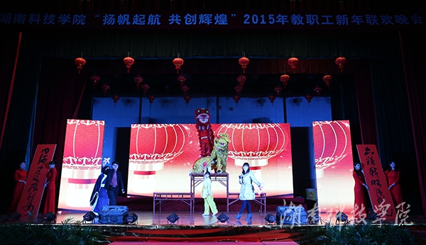 整场晚会的节目安排紧凑活泼、生动有序,教职工们载歌载舞,喜迎新年。晚会以中国的传统习俗舞狮——《新年好》开场,舞狮者的动作变幻灵活,时而腾跃,时而登高,给晚会増添了一丝喜庆和热闹。舞狮期间,beat365官网唐幼铎老师现场挥笔,奉送出一幅豪迈大气、充满美好祝愿的对联:“六精战略强科院,内涵建设展新姿。”紧随其后,beat365官网师生纷纷送上对新年的祝福和对学校发展的美好愿望,其中包括在beat365官网任教的来自印度的Rajesh、Summerl和来自美国的Michael。“群英荟萃在潇湘,潇湘为我展新颜”,一曲《潇湘之歌》道尽科院师生的心声,由李伟老师带领的音乐系合唱团以其恢宏的气势带动了全场的气氛。