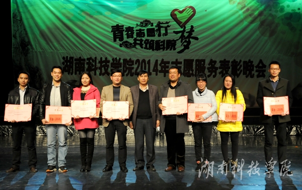 会上,校团委向14个系部发放2014年德育实践基地验收证书及活动资金,对电子工程系服务团等5个优秀团队,傅翠辉等5名优秀指导者,董磊等28名优秀个人,以及邓豪同学撰写的《九嶷山、舜文化旅游资源综合研究报告》等21篇优秀社会调查报告,王春等8名年度无偿献血先进个人,新闻系“邮亭圩小学义教”志愿服务项目等15个优秀志愿服务项目进行表彰。外语系志愿服务团副团长李爱琳激动的说道:“能参加志愿活动我感到十分快乐,将来我也愿更加努力,通过志愿服务团帮助他人,服务社会。”在场观众纷纷用热烈的掌声对表彰志愿者表示尊敬和祝贺。此外,2014年志愿服务图片展在爱莲湖畔同期进行,展现了各系服务团以及相关社会实践类社团深入乡镇、社区、学校开展志愿服务的风采。
