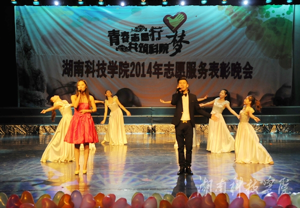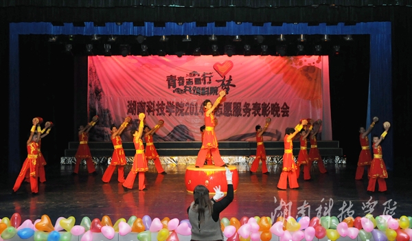 由各系志愿者代表带来的大合唱《青年志愿者之歌》拉开了晚会的序幕。晚会上,丰富多样的表演形式和精彩绝伦的表演内容赢得现场观众的阵阵赞叹。其中永州市特殊学校师生带来的舞蹈《鼓乐潇湘》展现特殊学校的孩子们超越常人的活力与梦想,将会场气氛推到高潮。新颖简约的环保时装秀更是吸引了众人眼球,绿色创意环保大赛的设计者用报纸做成别具一格的礼服,传递绿色环保理念。