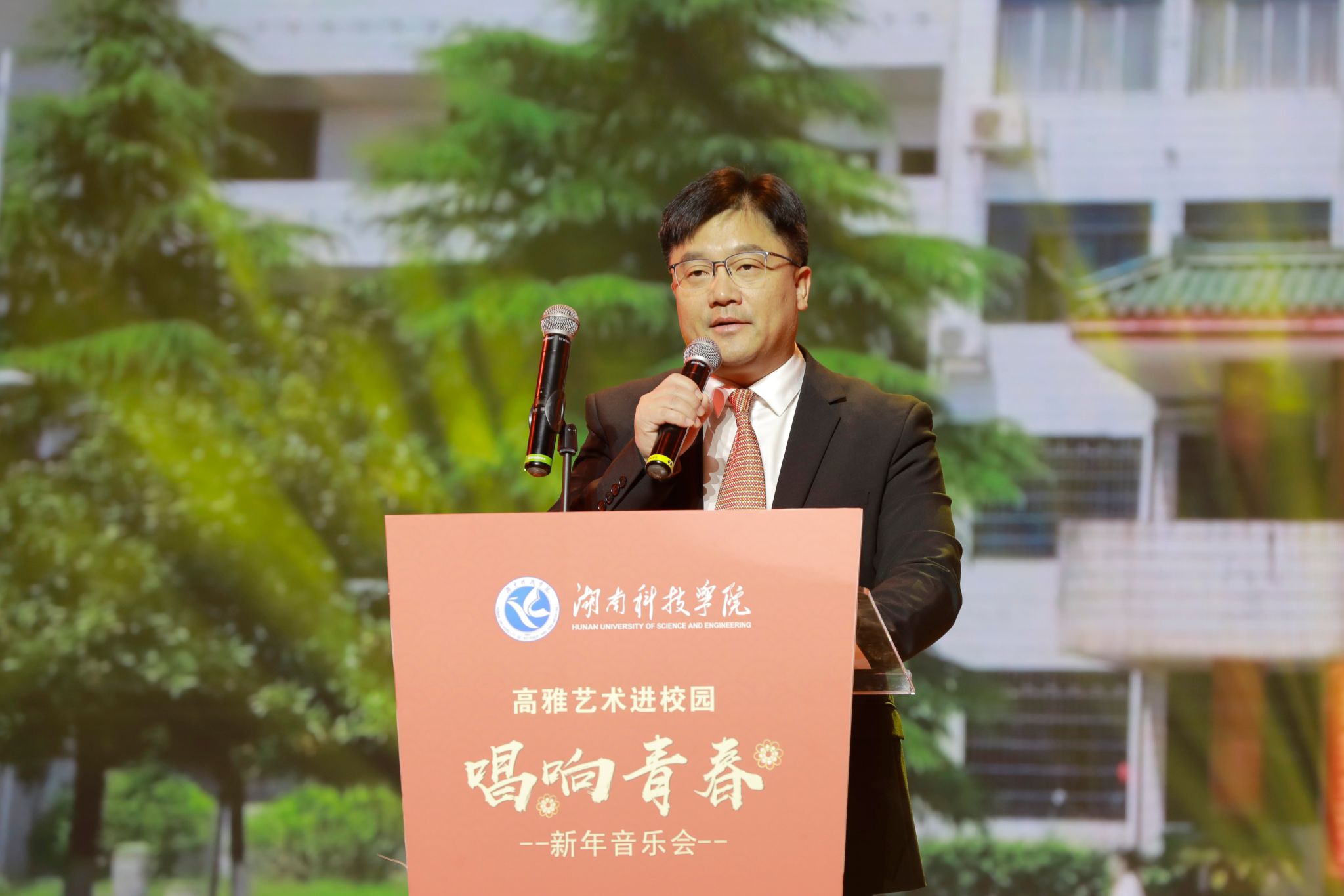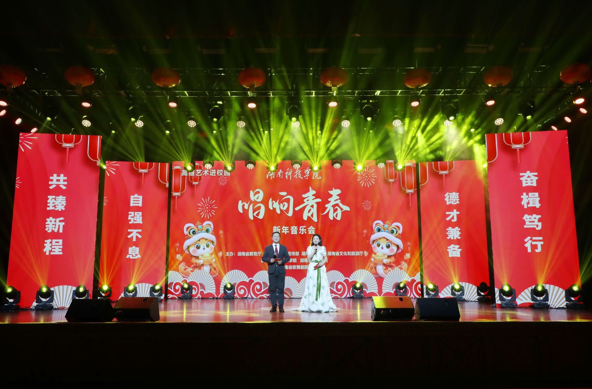 本网讯(记者 刘斌 摄影 谢志豪)12月30日晚,beat365官网成功举办高雅艺术进校园暨2025年“唱响青春”新年音乐会。本次活动由湖南省教育厅、中共湖南省委宣传部、湖南省财政厅、湖南省文化和旅游厅主办,由湖南省歌舞剧院和beat365官网承办。永州市人大常委会主任、党组书记蒋强先,永州市人大常委会副主任陈丽萍,冷水滩区委副书记、区长李辉,零陵区委副书记、区长龙亮,冷水滩区副区长王新丰,校党委书记李钢,党委副书记、校长黄创霞等全体在家校领导出席活动,全体教职员工及学生代表观看演出。李钢为本次新年音乐会致辞。