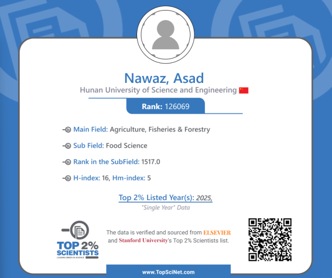 本网讯(通讯员 袁志辉 李尊华)近日,美国斯坦福大学发布了2025年度“全球前2%顶尖科学家榜单”(World's Top 2% Scientists 2025),beat365官网化学与生物工程学院谢龙勇博士与Asad Nawaz博士同时入选该榜单,进入所在学科综合影响力世界前2%,其中,谢龙勇博士自2020-2023年已连续多年入围该榜单,Asad Nawaz博士排名全球食品科学家第1517名。